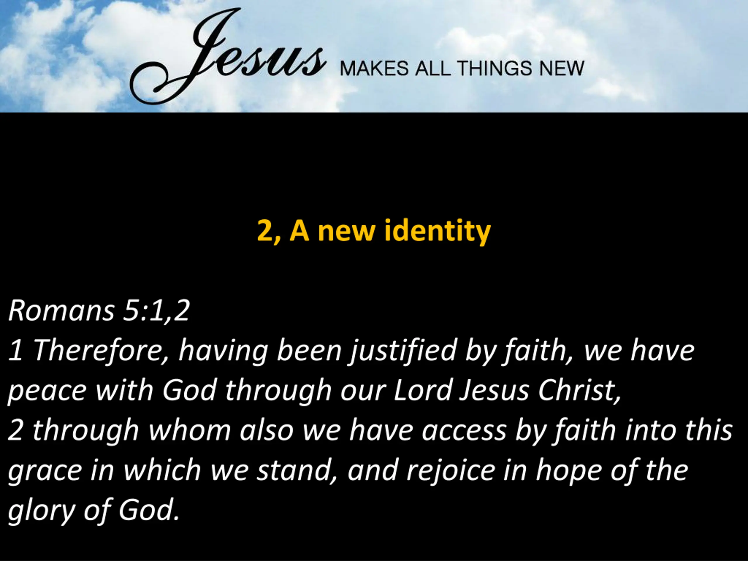 2, A new identity Romans 5:1,2 1 Therefore, having been justified by faith, we have peace with God through our Lord Jesus Christ, 2 through whom also we have access by faith into this grace in which we stand, and rejoice in hope of the glory of God.