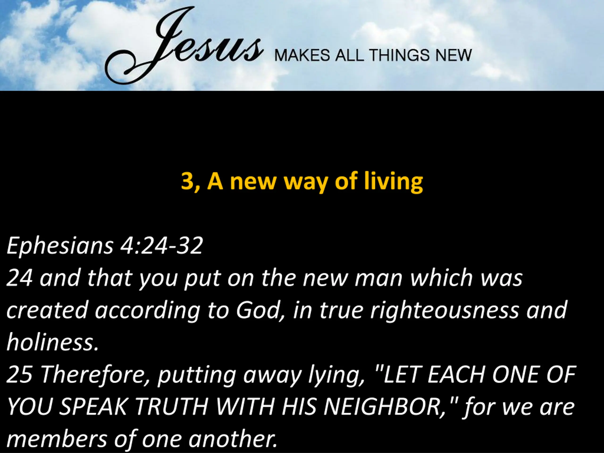 3, A new way of living Ephesians 4:24-32 24 and that you put on the new man which was created according to God, in true righteousness and holiness. 25 Therefore, putting away lying, "LET EACH ONE OF YOU SPEAK TRUTH WITH HIS NEIGHBOR," for we are members of one another.