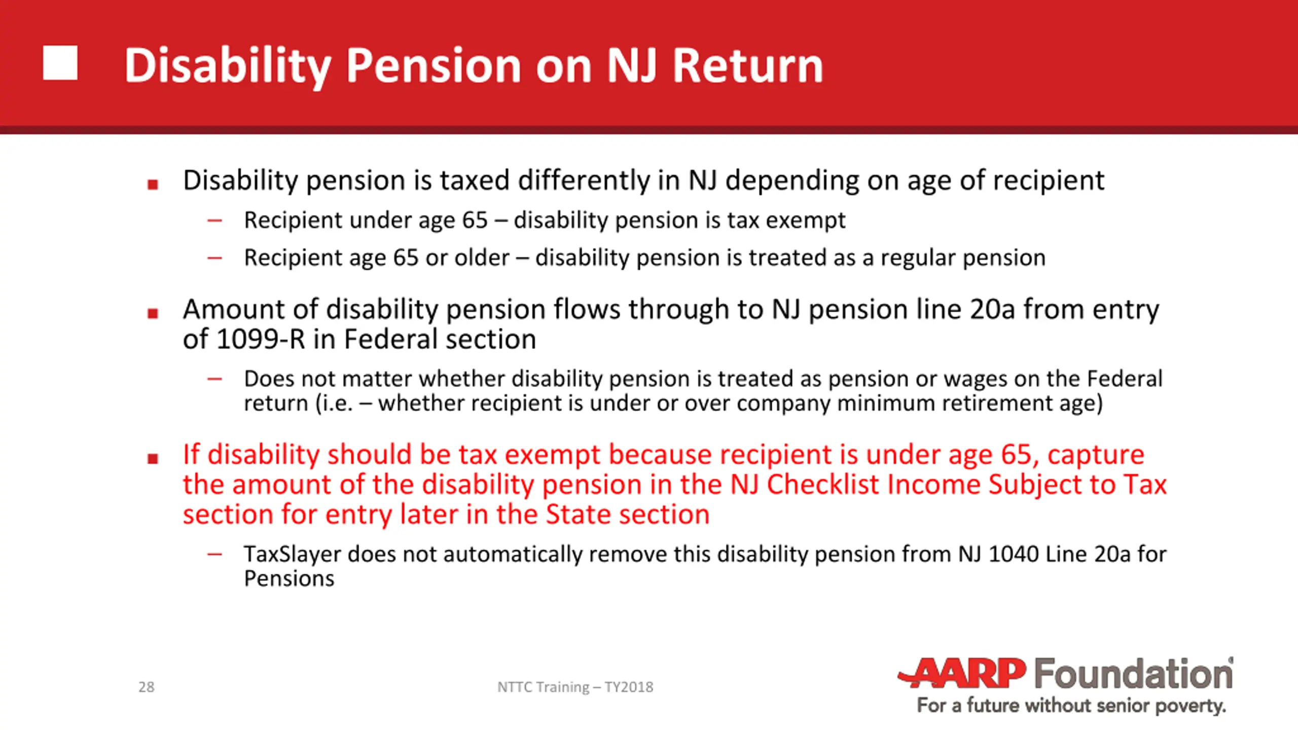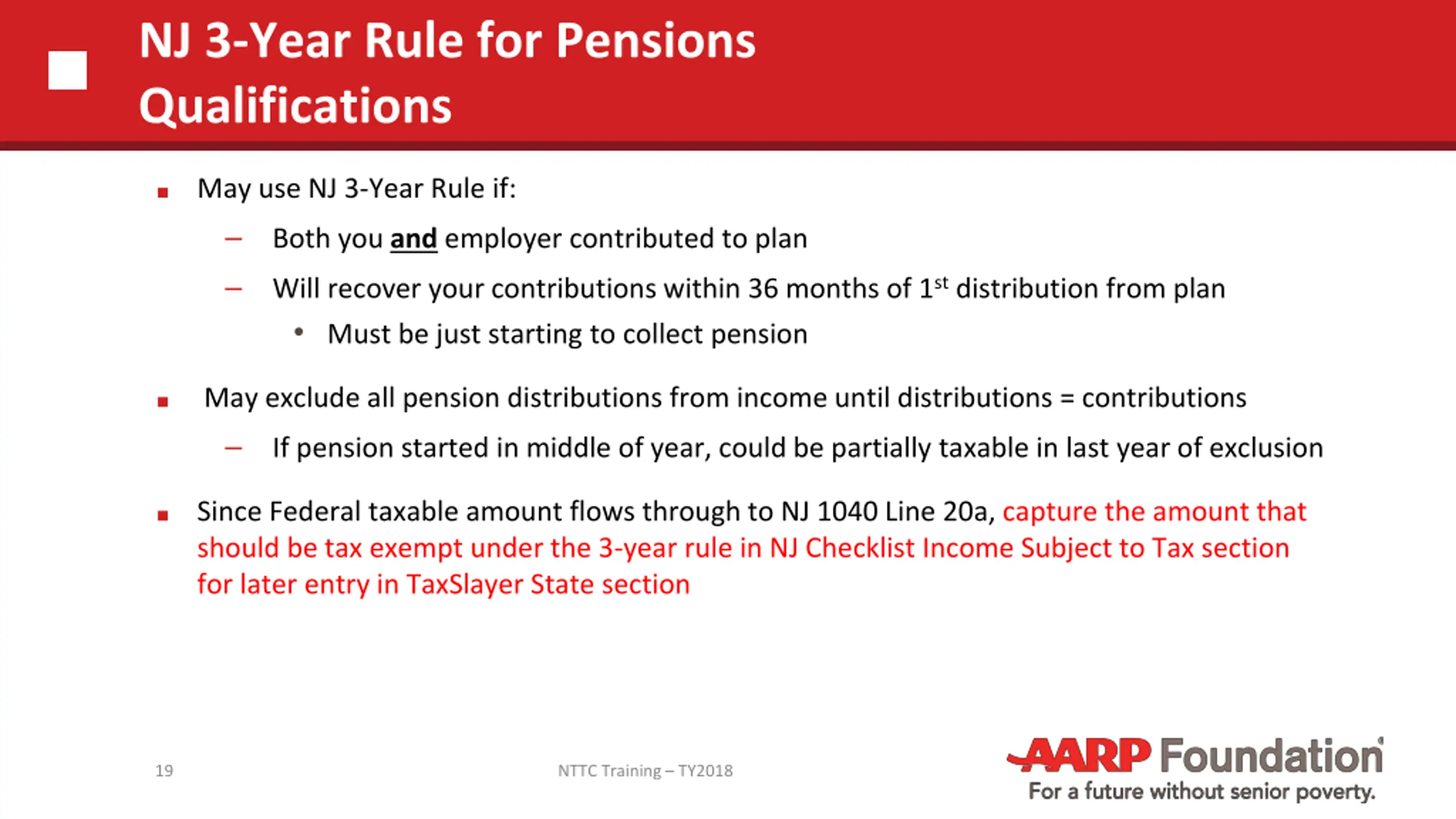 NJ 3-Year Rule for Pensions Qualifications Once all contributions are recovered under 3-year rule, all of pension distributions will be taxable for NJ. Capture the amount of pension income to be added back into taxable NJ pension income on Line 20a in NJ Checklist Income Subject to Tax section for later entry in TaxSlayer State section 20 NTTC Training TY2018