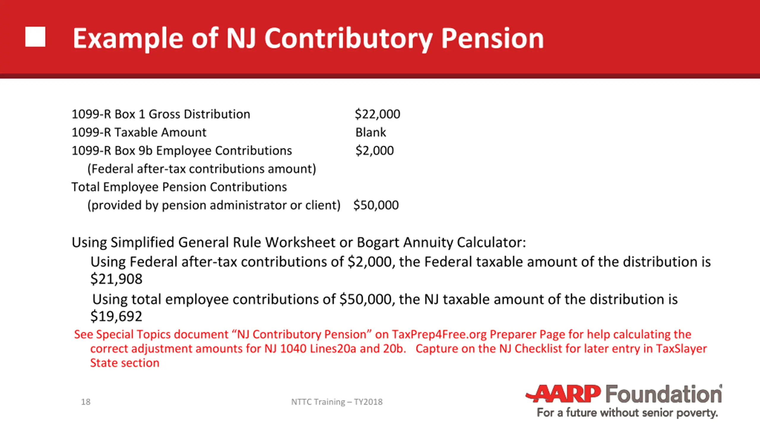 Example of NJ Contributory Pension 1099-R Box 1 Gross Distribution $22,000 1099-R Taxable Amount Blank 1099-R Box 9b Employee Contributions $2,000 (Federal after-tax contributions amount) Total Employee Pension Contributions (provided by pension administrator or client) $50,000 Using Simplified General Rule Worksheet or Bogart Annuity Calculator: Using Federal after-tax contributions of $2,000, the Federal taxable amount of the distribution is $21,908 Using total employee contributions of $50,000, the NJ taxable amount of the distribution is $19,692 See Special Topics document NJ Contributory Pension on TaxPrep4Free.org Preparer Page for help calculating the correct adjustment amounts for NJ 1040 Lines20a and 20b. Capture on the NJ Checklist for later entry in TaxSlayer State section 18 NTTC Training TY2018