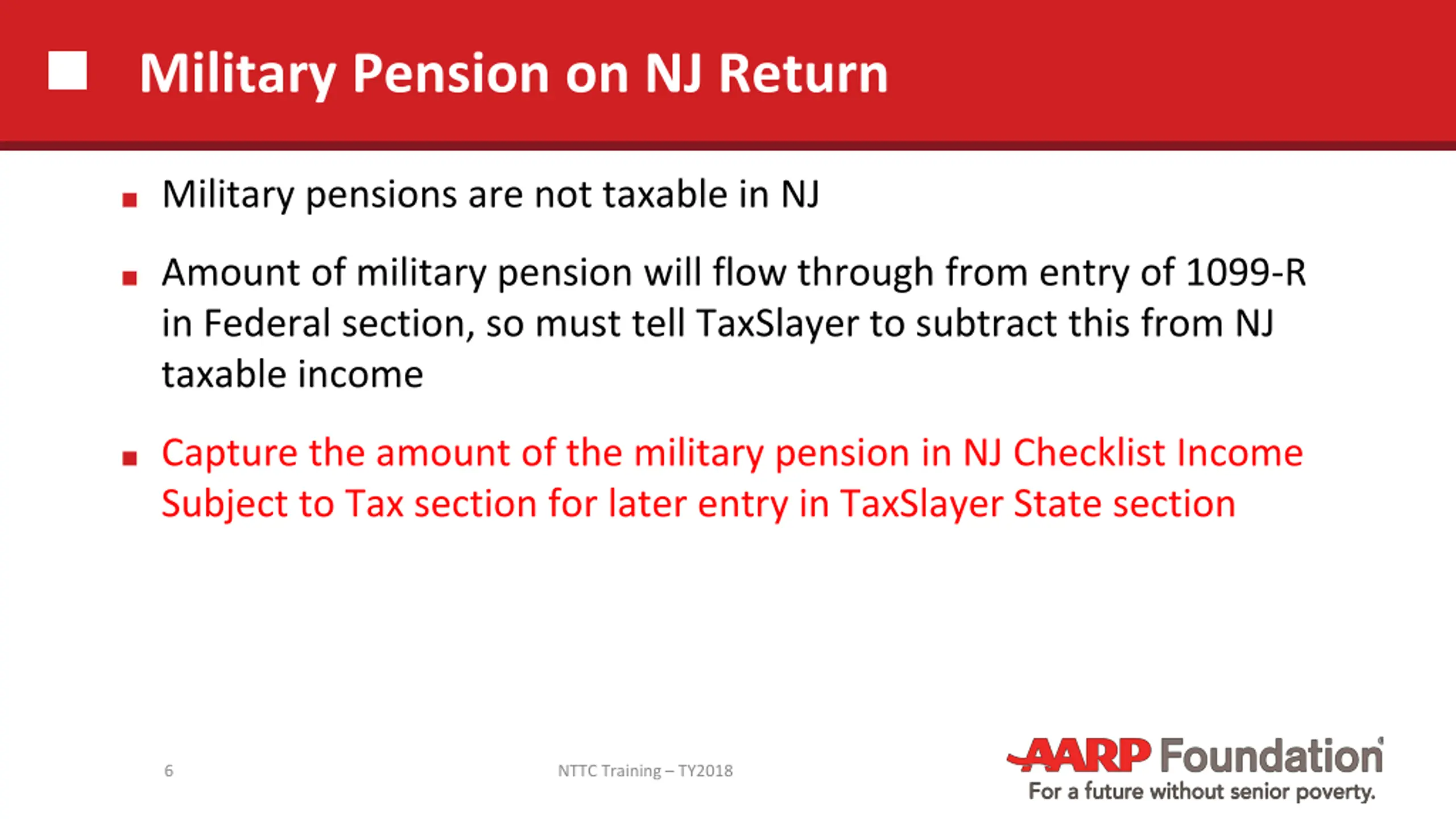 Military Pension on NJ Return Military pensions are not taxable in NJ Amount of military pension will flow through from entry of 1099-R in Federal section, so must tell TaxSlayer to subtract this from NJ taxable income Capture the amount of the military pension in NJ Checklist Income Subject to Tax section for later entry in TaxSlayer State section 6 NTTC Training TY2018