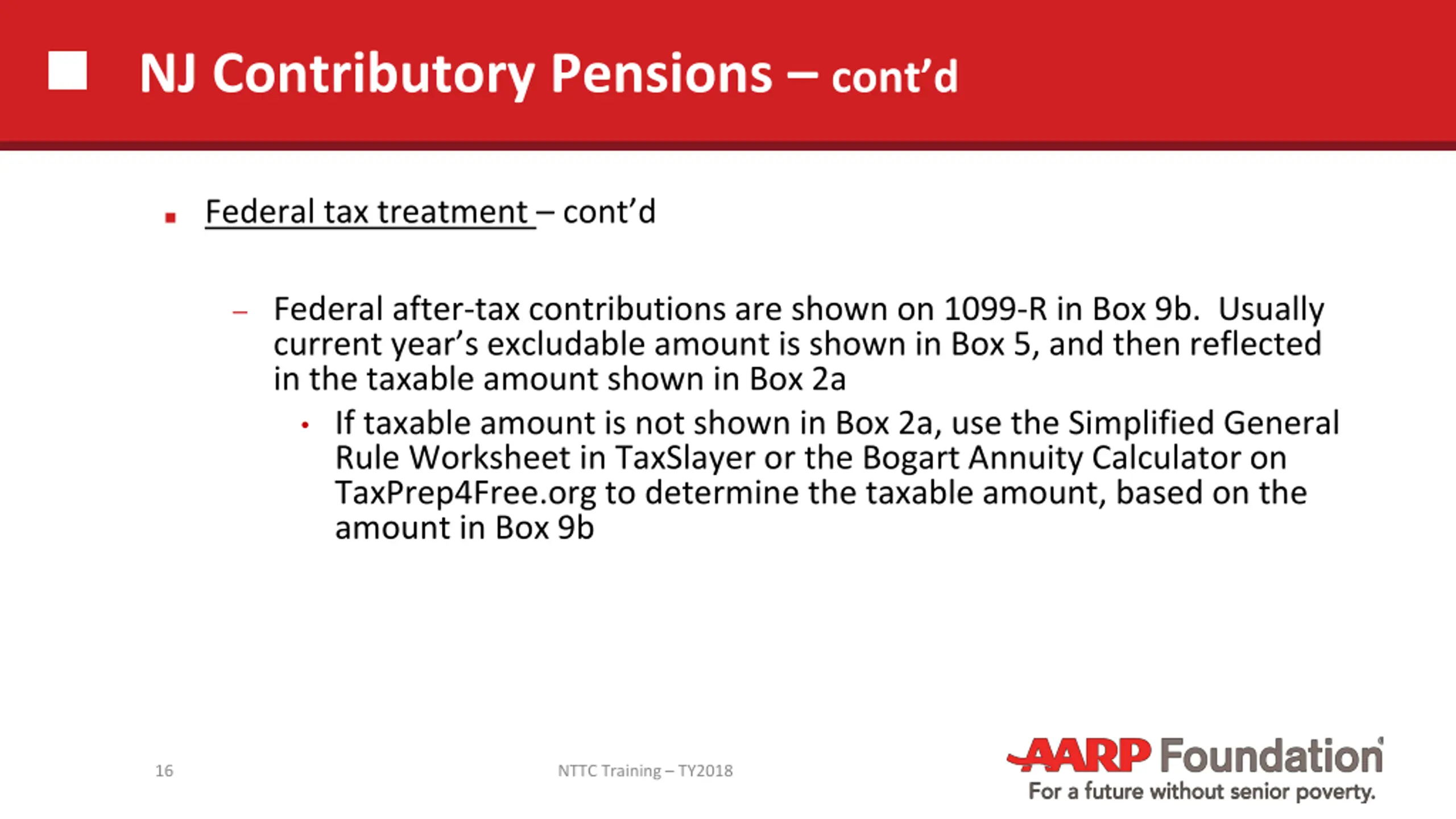 NJ Contributory Pensions contd Federal tax treatment cont d Federal after-tax contributions are shown on 1099-R in Box 9b. Usually current year s excludable amount is shown in Box 5, and then reflected in the taxable amount shown in Box 2a If taxable amount is not shown in Box 2a, use the Simplified General Rule Worksheet in TaxSlayer or the Bogart Annuity Calculator on TaxPrep4Free.org to determine the taxable amount, based on the amount in Box 9b 16 NTTC Training TY2018