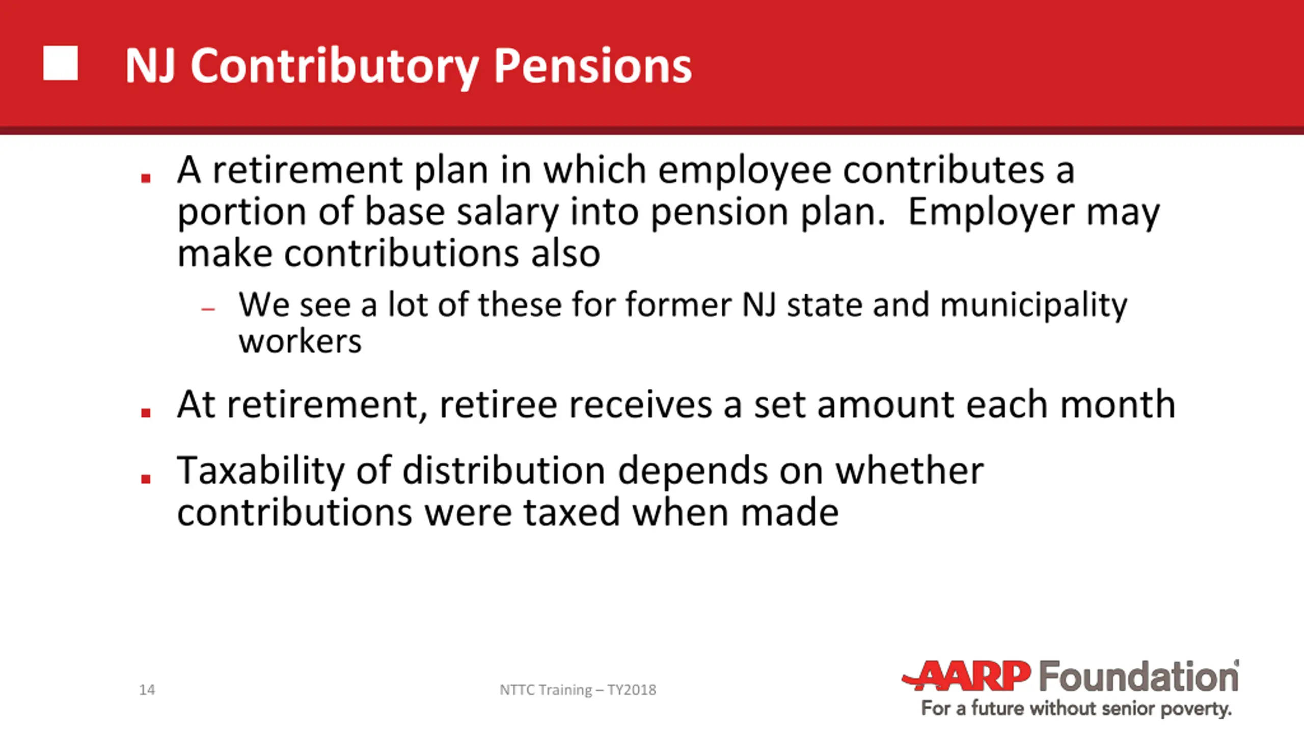 NJ Contributory Pensions A retirement plan in which employee contributes a portion of base salary into pension plan. Employer may make contributions also We see a lot of these for former NJ state and municipality workers At retirement, retiree receives a set amount each month Taxability of distribution depends on whether contributions were taxed when made 14 NTTC Training TY2018