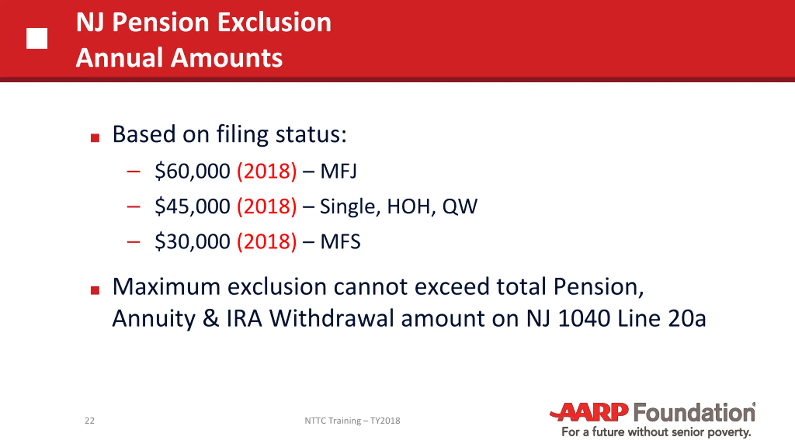 NJ Pension Exclusion Annual Amounts Based on filing status: $60,000 (2018) MFJ $45,000 (2018) Single, HOH, QW $30,000 (2018) MFS Maximum exclusion cannot exceed total Pension, Annuity & IRA Withdrawal amount on NJ 1040 Line 20a 22 NTTC Training TY2018