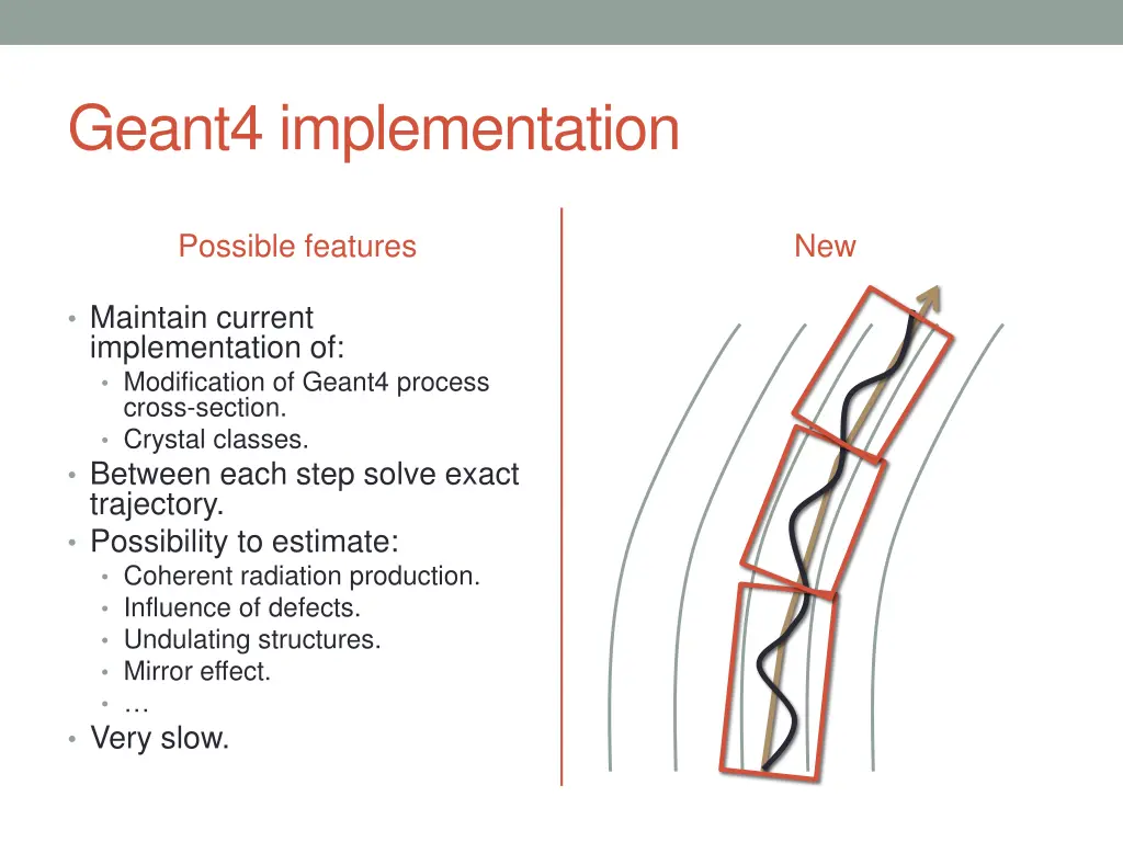 Geant4 implementation Possible features New Maintain current implementation of: Modification of Geant4 process cross-section. Crystal classes. Between each step solve exact trajectory. Possibility to estimate: Coherent radiation production. Influence of defects. Undulating structures. Mirror effect. Very slow.