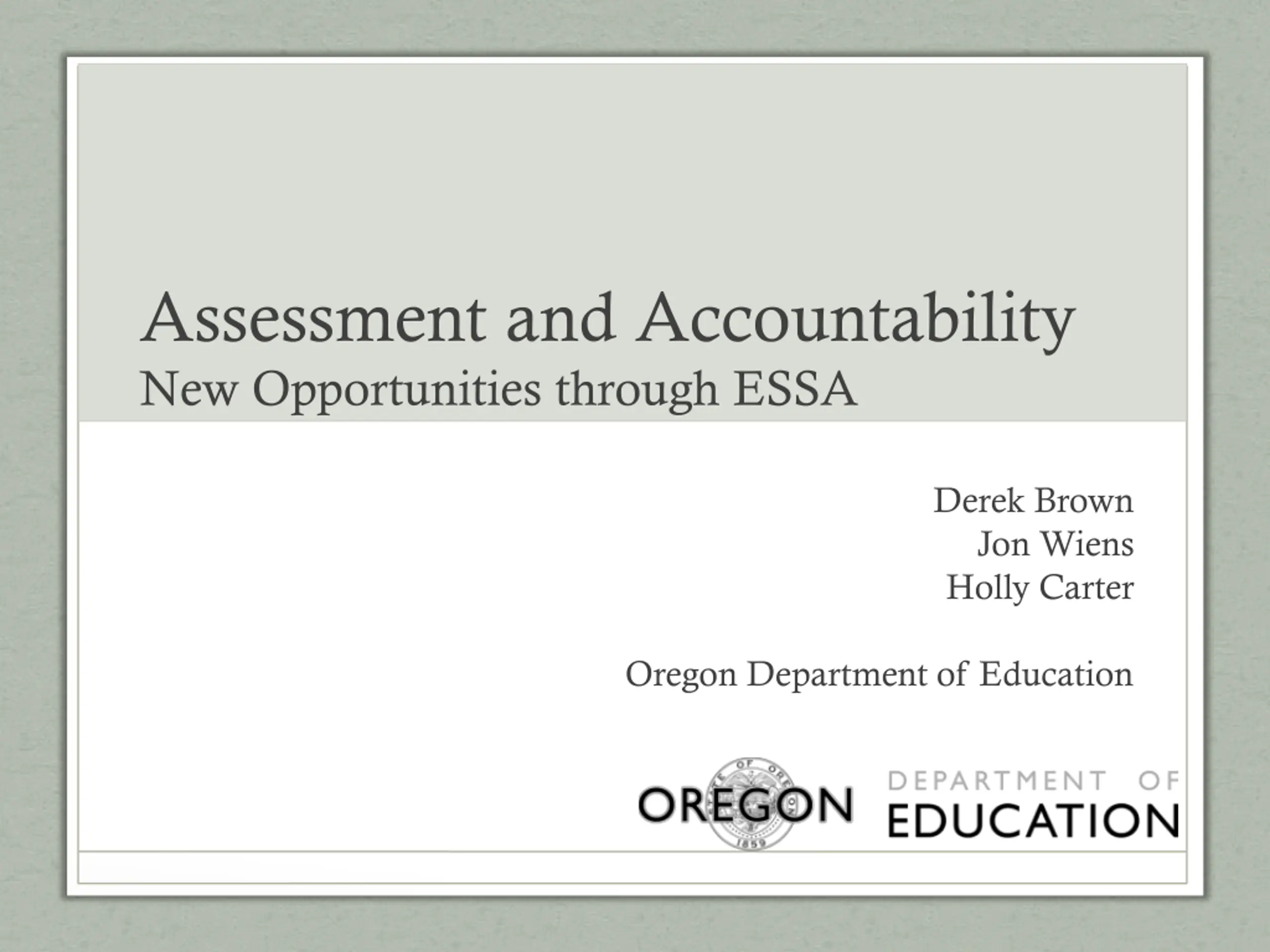 Assessment and Accountability New Opportunities through ESSA Derek Brown Jon Wiens Holly Carter Oregon Department of Education