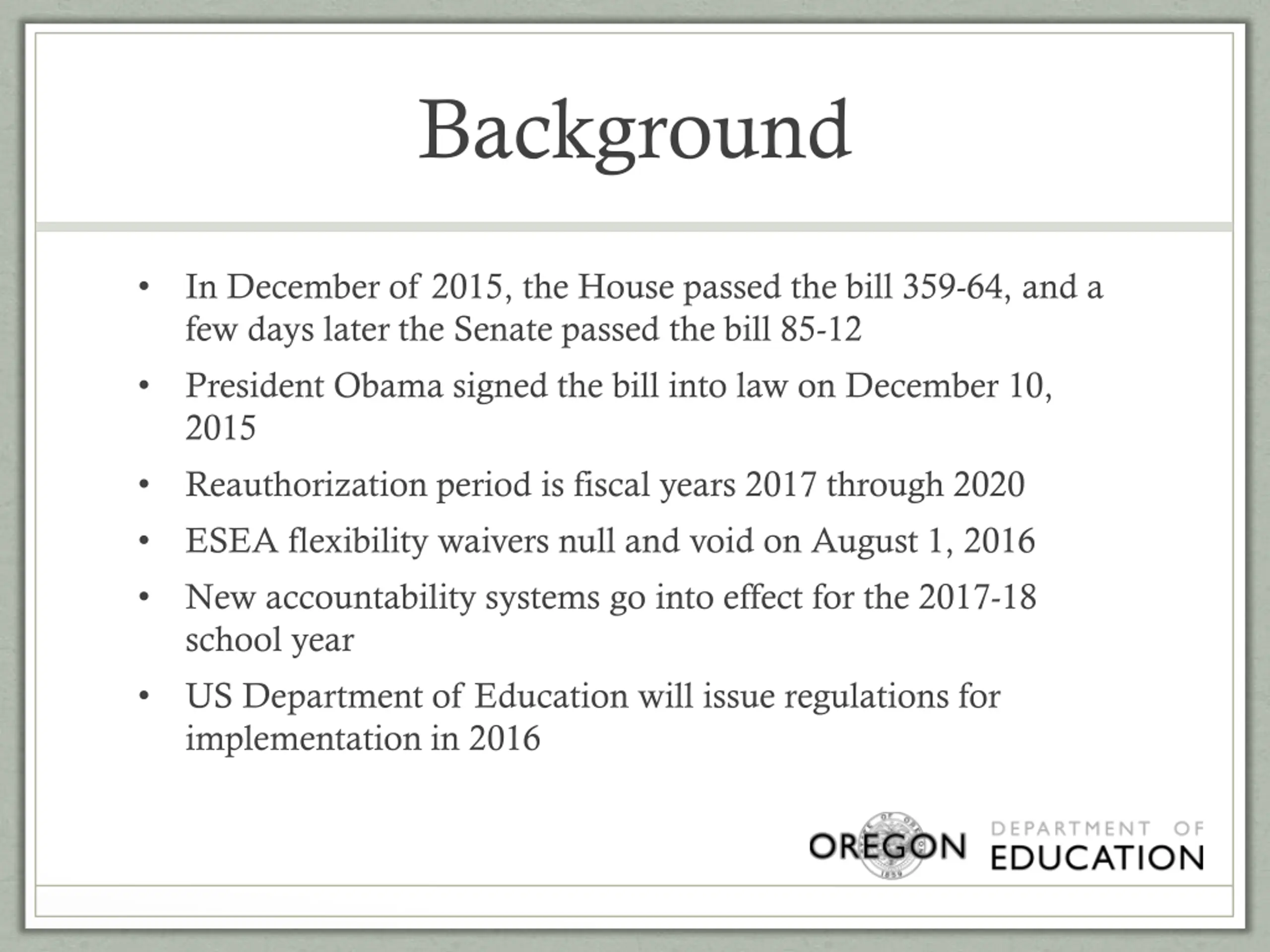 Background In December of 2015, the House passed the bill 359-64, and a few days later the Senate passed the bill 85-12 President Obama signed the bill into law on December 10, 2015 Reauthorization period is fiscal years 2017 through 2020 ESEA flexibility waivers null and void on August 1, 2016 New accountability systems go into effect for the 2017-18 school year US Department of Education will issue regulations for implementation in 2016