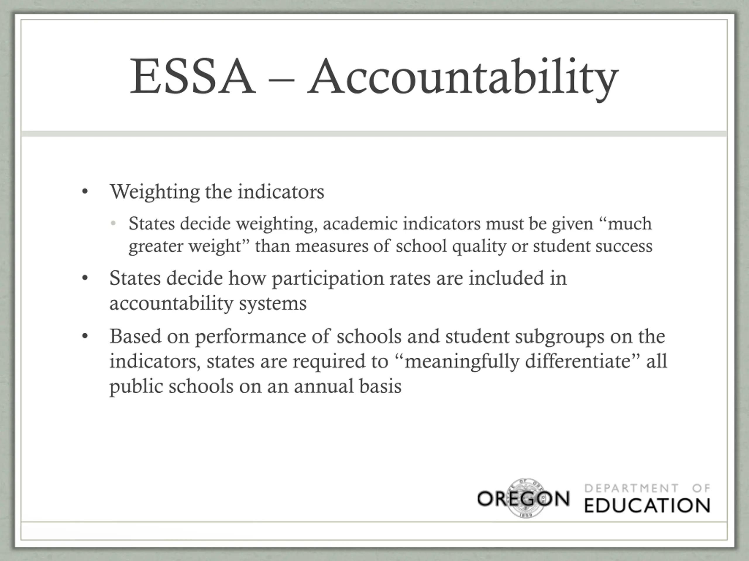 ESSA Accountability Weighting the indicators States decide weighting, academic indicators must be given much greater weight than measures of school quality or student success States decide how participation rates are included in accountability systems Based on performance of schools and student subgroups on the indicators, states are required to meaningfully differentiate all public schools on an annual basis