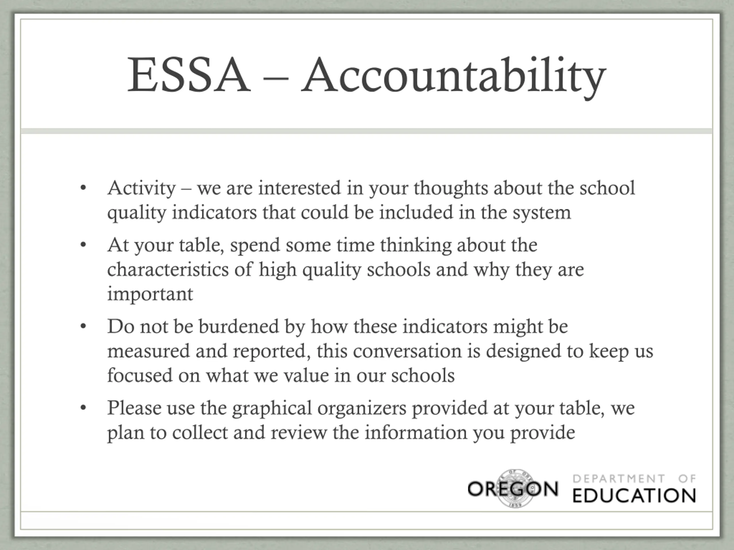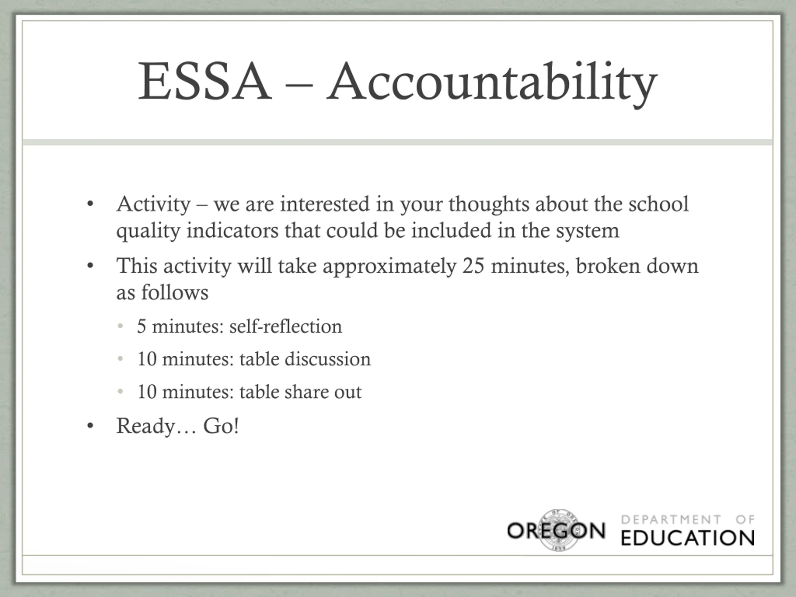 ESSA Accountability Activity we are interested in your thoughts about the school quality indicators that could be included in the system This activity will take approximately 25 minutes, broken down as follows 5 minutes: self-reflection 10 minutes: table discussion 10 minutes: table share out Ready Go!