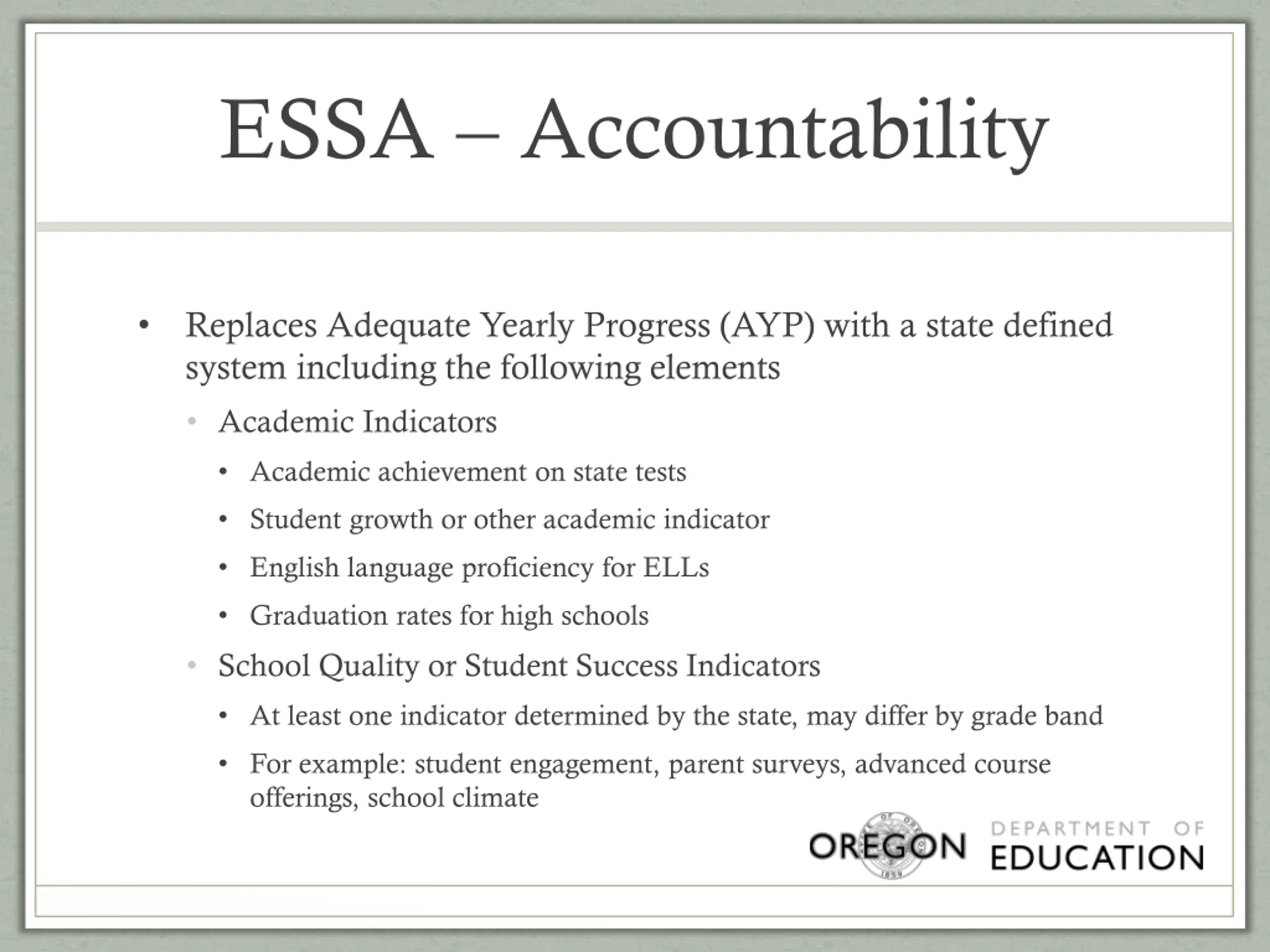 ESSA Accountability Replaces Adequate Yearly Progress (AYP) with a state defined system including the following elements Academic Indicators Academic achievement on state tests Student growth or other academic indicator English language proficiency for ELLs Graduation rates for high schools School Quality or Student Success Indicators At least one indicator determined by the state, may differ by grade band For example: student engagement, parent surveys, advanced course offerings, school climate