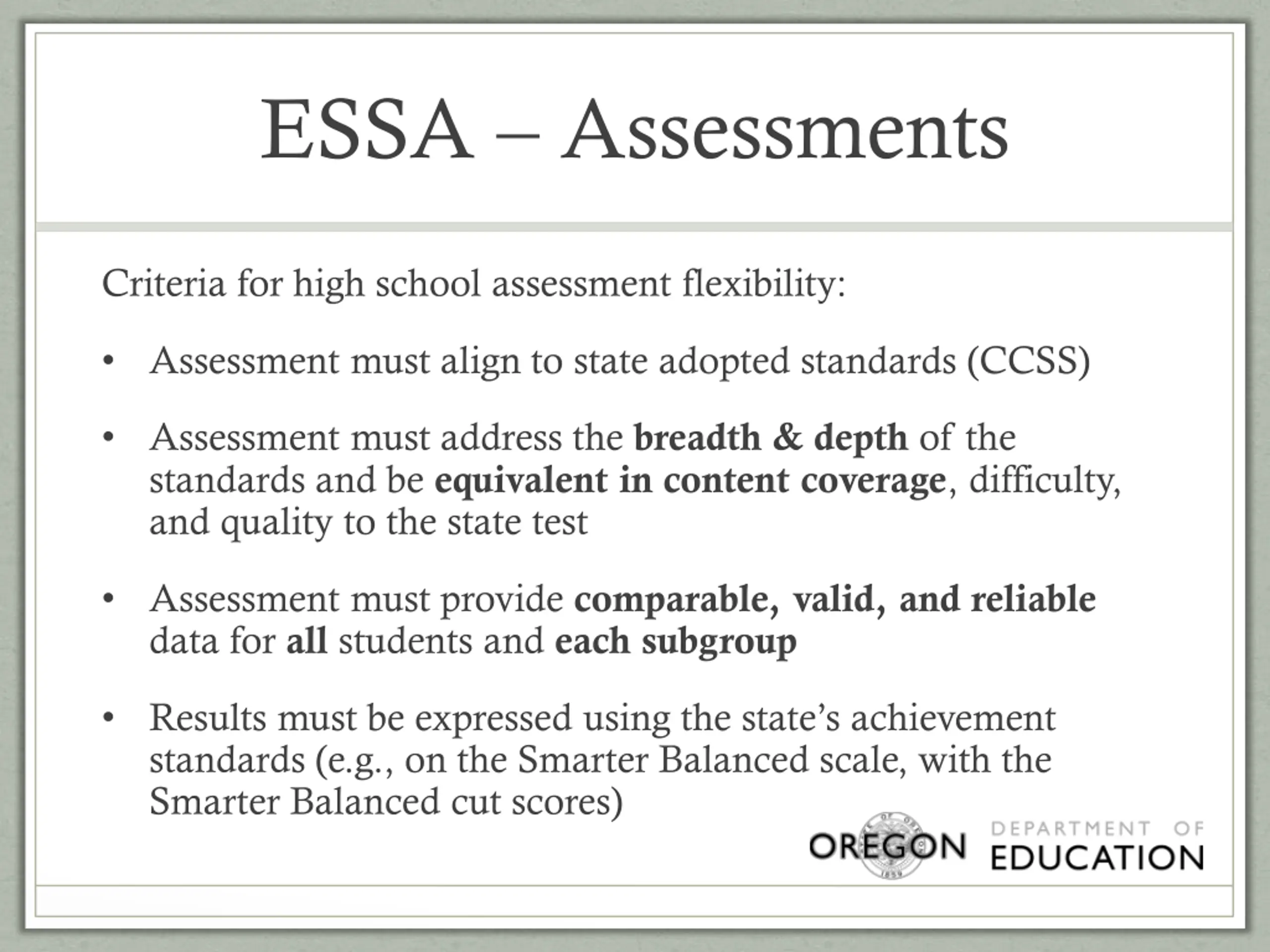 ESSA Assessments Criteria for high school assessment flexibility: Assessment must align to state adopted standards (CCSS) Assessment must address the breadth & depth of the standards and be equivalent in content coverage, difficulty, and quality to the state test Assessment must provide comparable, valid, and reliable data for all students and each subgroup Results must be expressed using the state s achievement standards (e.g., on the Smarter Balanced scale, with the Smarter Balanced cut scores)