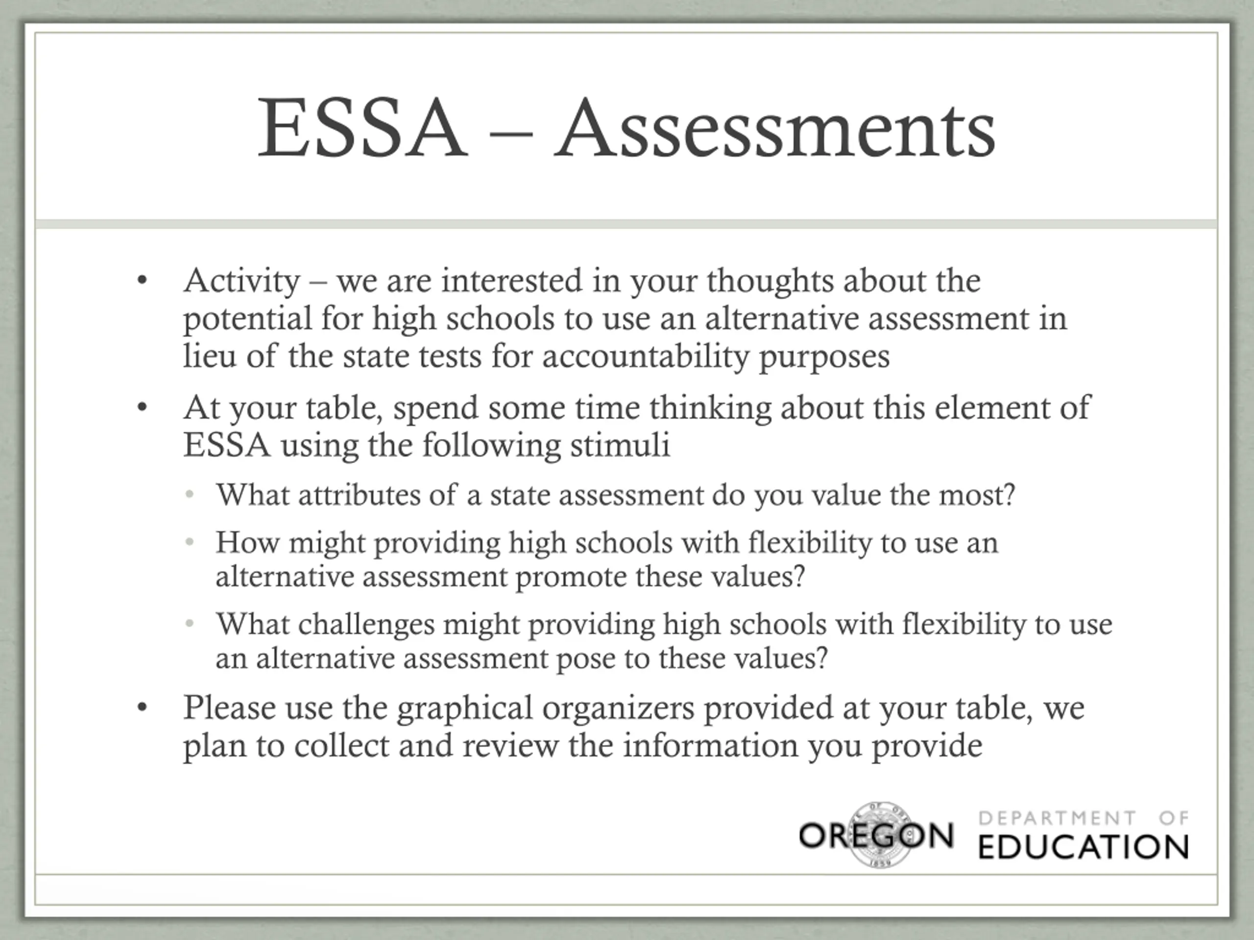 ESSA Assessments Activity we are interested in your thoughts about the potential for high schools to use an alternative assessment in lieu of the state tests for accountability purposes At your table, spend some time thinking about this element of ESSA using the following stimuli What attributes of a state assessment do you value the most? How might providing high schools with flexibility to use an alternative assessment promote these values? What challenges might providing high schools with flexibility to use an alternative assessment pose to these values? Please use the graphical organizers provided at your table, we plan to collect and review the information you provide