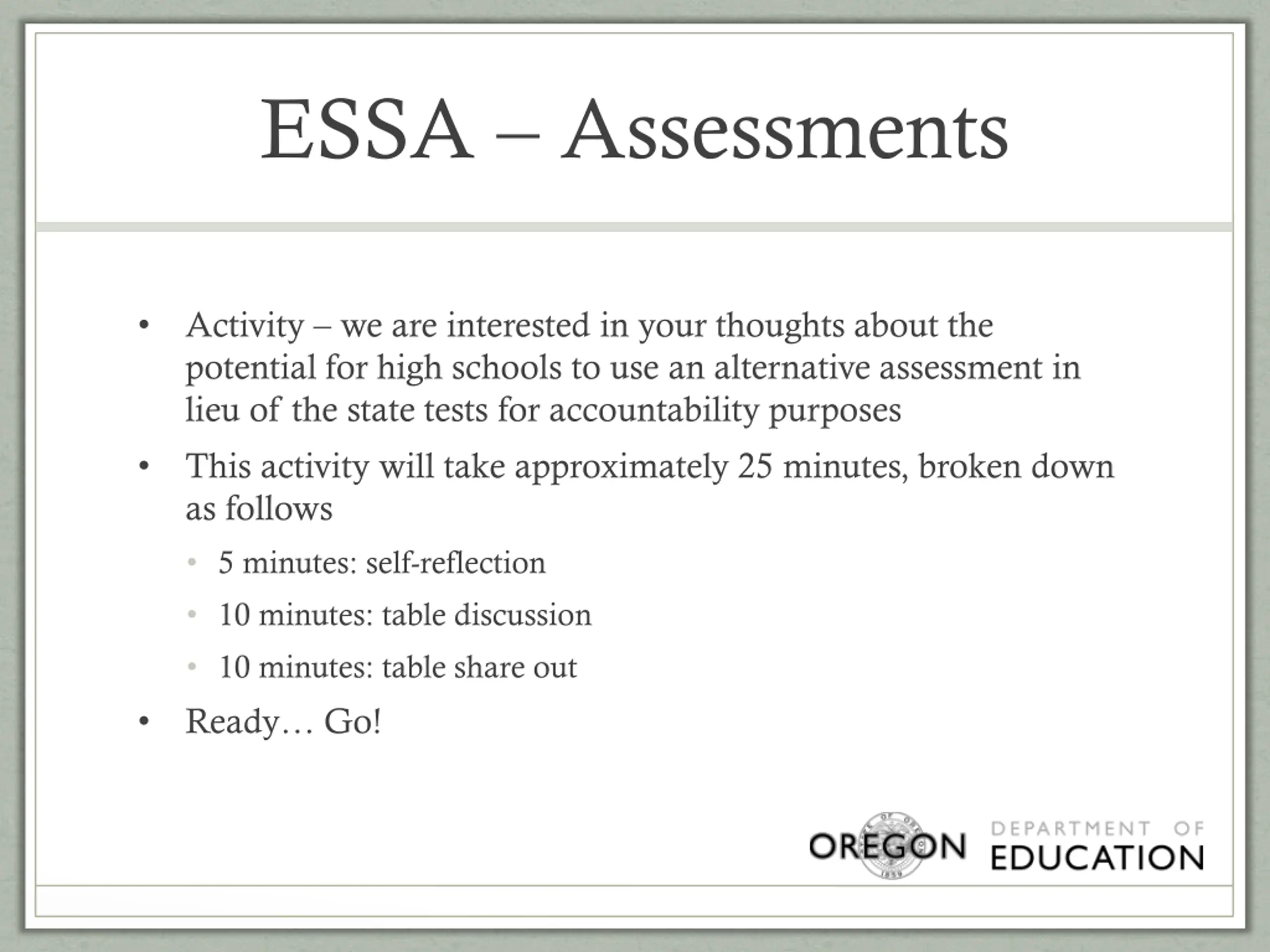 ESSA Assessments Activity we are interested in your thoughts about the potential for high schools to use an alternative assessment in lieu of the state tests for accountability purposes This activity will take approximately 25 minutes, broken down as follows 5 minutes: self-reflection 10 minutes: table discussion 10 minutes: table share out Ready Go!