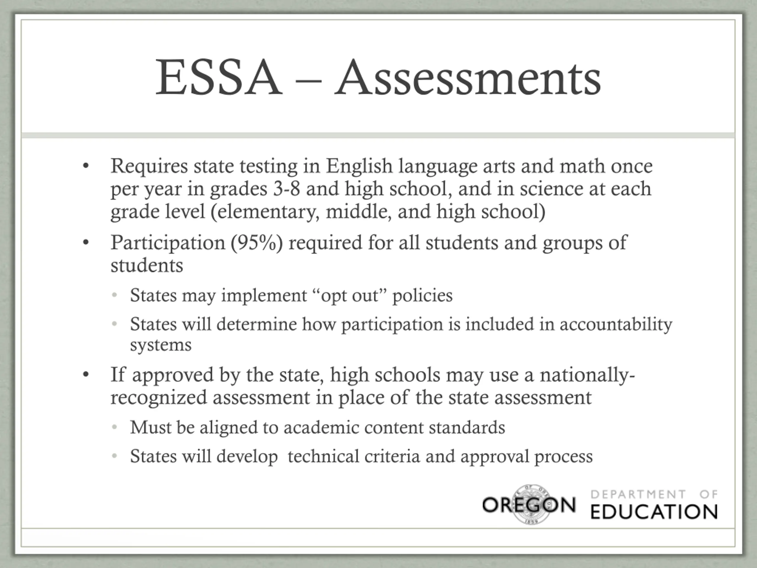 ESSA Assessments Requires state testing in English language arts and math once per year in grades 3-8 and high school, and in science at each grade level (elementary, middle, and high school) Participation (95%) required for all students and groups of students States may implement opt out policies States will determine how participation is included in accountability systems If approved by the state, high schools may use a nationally- recognized assessment in place of the state assessment Must be aligned to academic content standards States will develop technical criteria and approval process