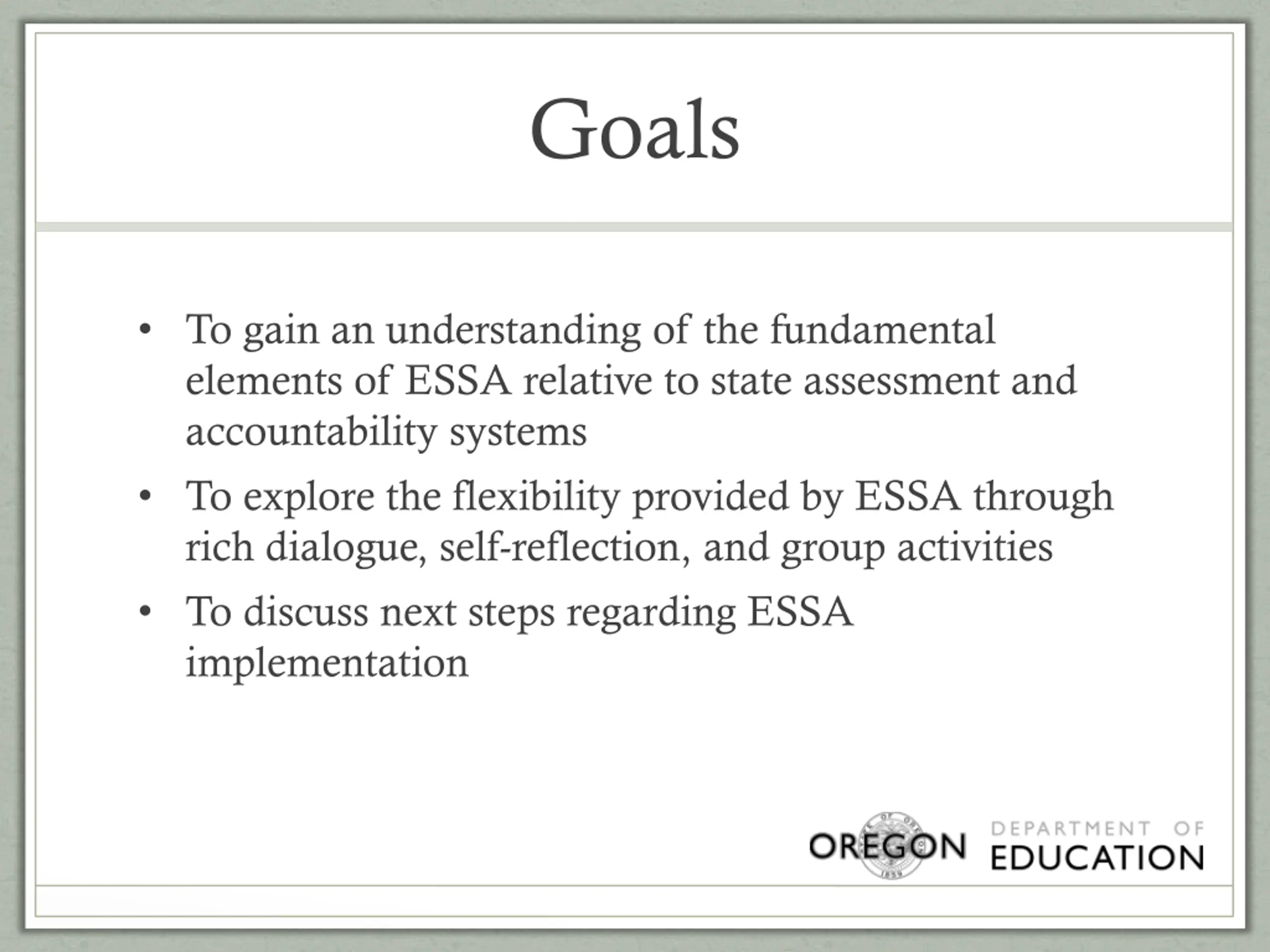 Goals To gain an understanding of the fundamental elements of ESSA relative to state assessment and accountability systems To explore the flexibility provided by ESSA through rich dialogue, self-reflection, and group activities To discuss next steps regarding ESSA implementation