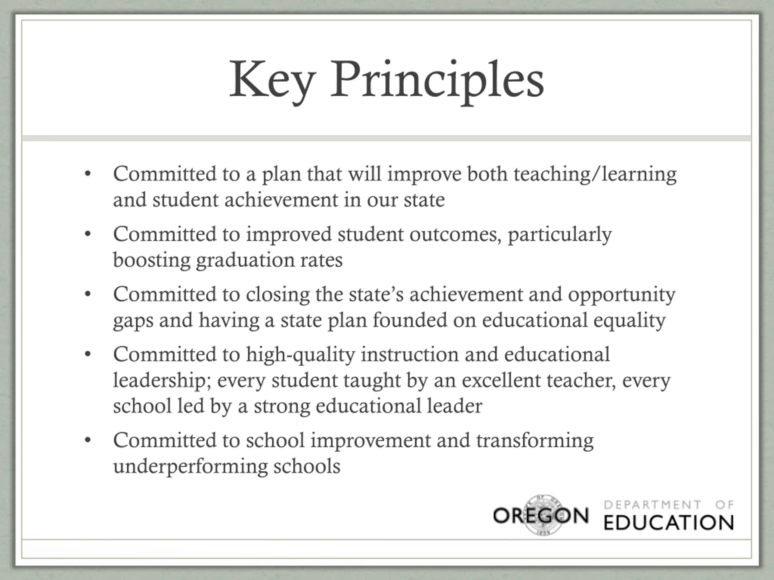 Key Principles Committed to a plan that will improve both teaching/learning and student achievement in our state Committed to improved student outcomes, particularly boosting graduation rates Committed to closing the state s achievement and opportunity gaps and having a state plan founded on educational equality Committed to high-quality instruction and educational leadership; every student taught by an excellent teacher, every school led by a strong educational leader Committed to school improvement and transforming underperforming schools
