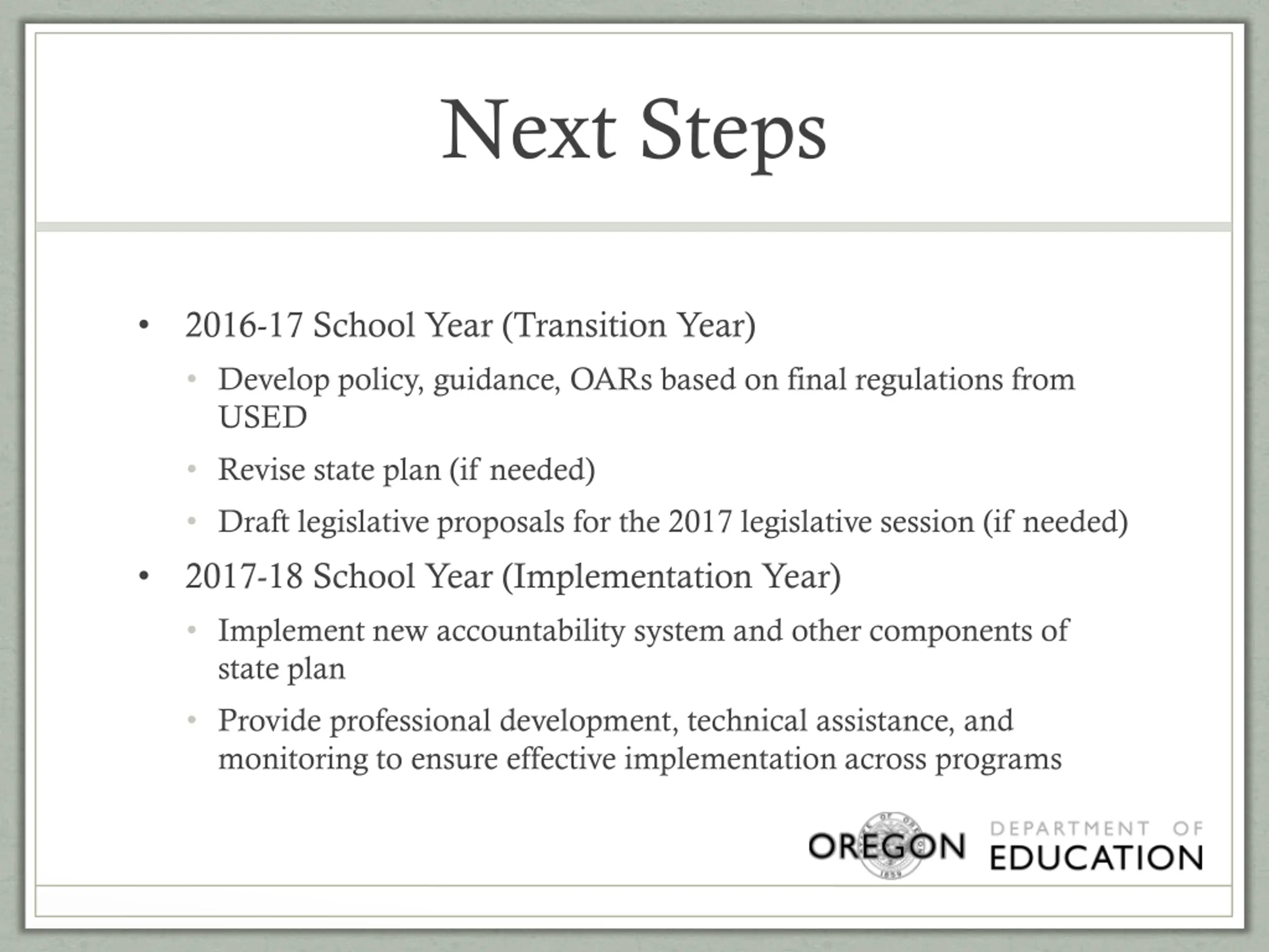 Next Steps 2016-17 School Year (Transition Year) Develop policy, guidance, OARs based on final regulations from USED Revise state plan (if needed) Draft legislative proposals for the 2017 legislative session (if needed) 2017-18 School Year (Implementation Year) Implement new accountability system and other components of state plan Provide professional development, technical assistance, and monitoring to ensure effective implementation across programs