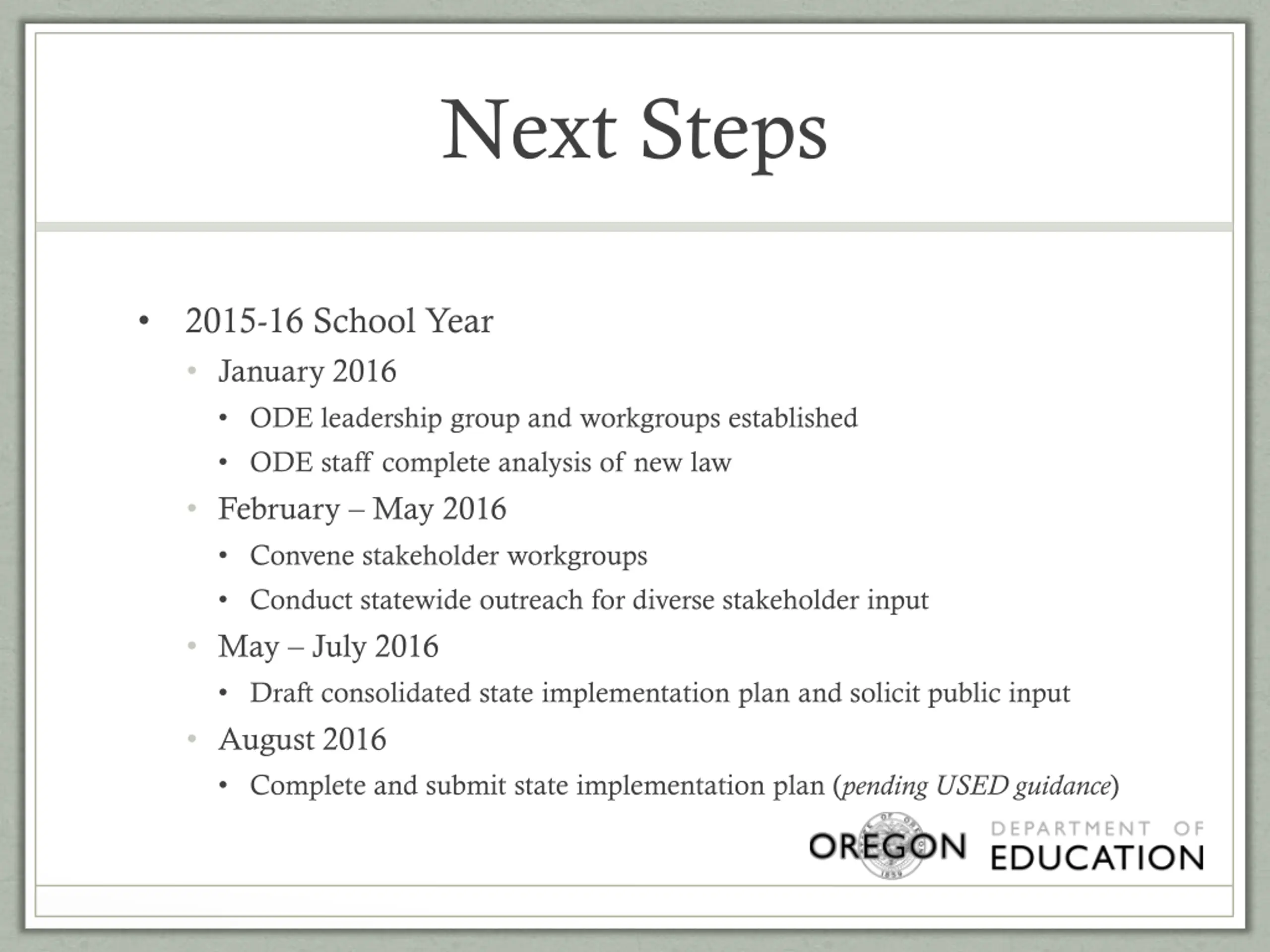 Next Steps 2015-16 School Year January 2016 ODE leadership group and workgroups established ODE staff complete analysis of new law February May 2016 Convene stakeholder workgroups Conduct statewide outreach for diverse stakeholder input May July 2016 Draft consolidated state implementation plan and solicit public input August 2016 Complete and submit state implementation plan (pending USED guidance)