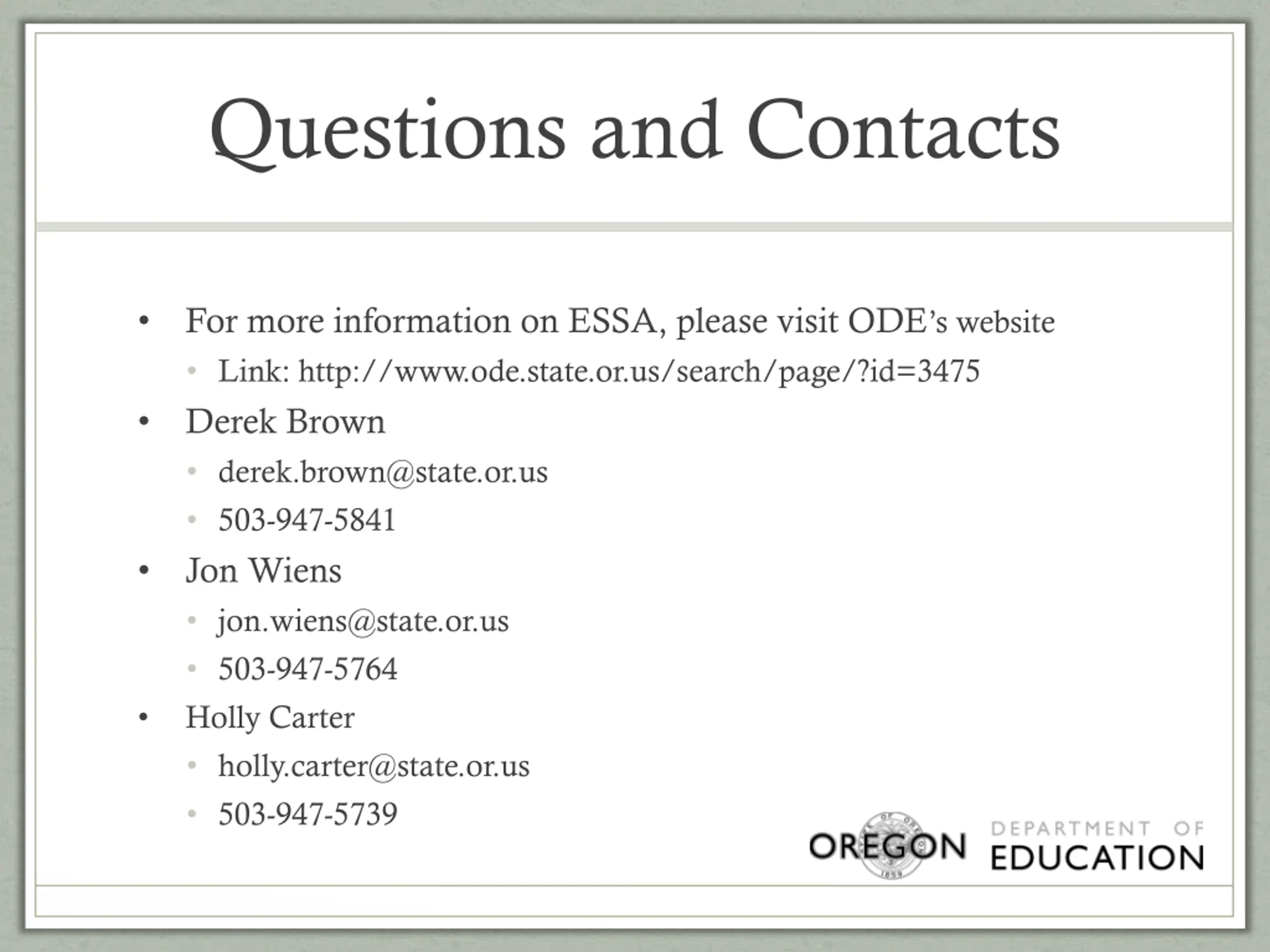 Questions and Contacts For more information on ESSA, please visit ODE s website Link: http://www.ode.state.or.us/search/page/?id=3475 Derek Brown derek.brown@state.or.us 503-947-5841 Jon Wiens jon.wiens@state.or.us 503-947-5764 Holly Carter holly.carter@state.or.us 503-947-5739