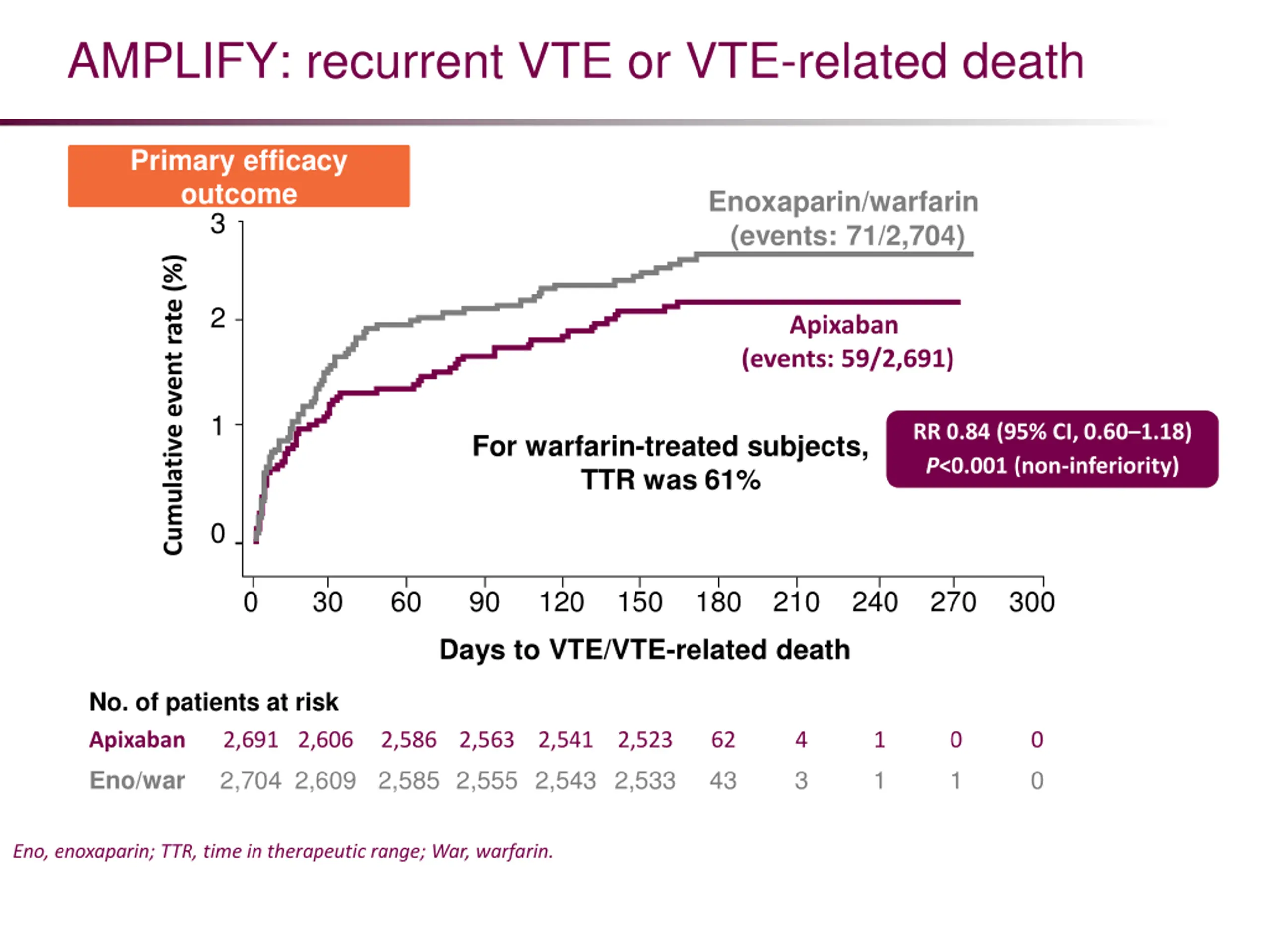 AMPLIFY: recurrent VTE or VTE-related death Primary efficacy outcome Enoxaparin/warfarin (events: 71/2,704) 3 Cumulative event rate (%) 2 Apixaban (events: 59/2,691) 1 RR 0.84 (95% CI, 0.60 1.18) P<0.001 (non-inferiority) For warfarin-treated subjects, TTR was 61% 0 0 30 60 90 120 150 180 210 240 270 300 Days to VTE/VTE-related death No. of patients at risk Apixaban Eno/war 2,691 2,606 2,704 2,609 2,585 2,555 2,543 2,533 2,586 2,563 2,541 2,523 62 43 4 3 1 1 0 1 0 0 Eno, enoxaparin; TTR, time in therapeutic range; War, warfarin. ELQ771b Date of preparation: June 2015 Agnelli et al. N Engl J Med. 2013;369:799 808.