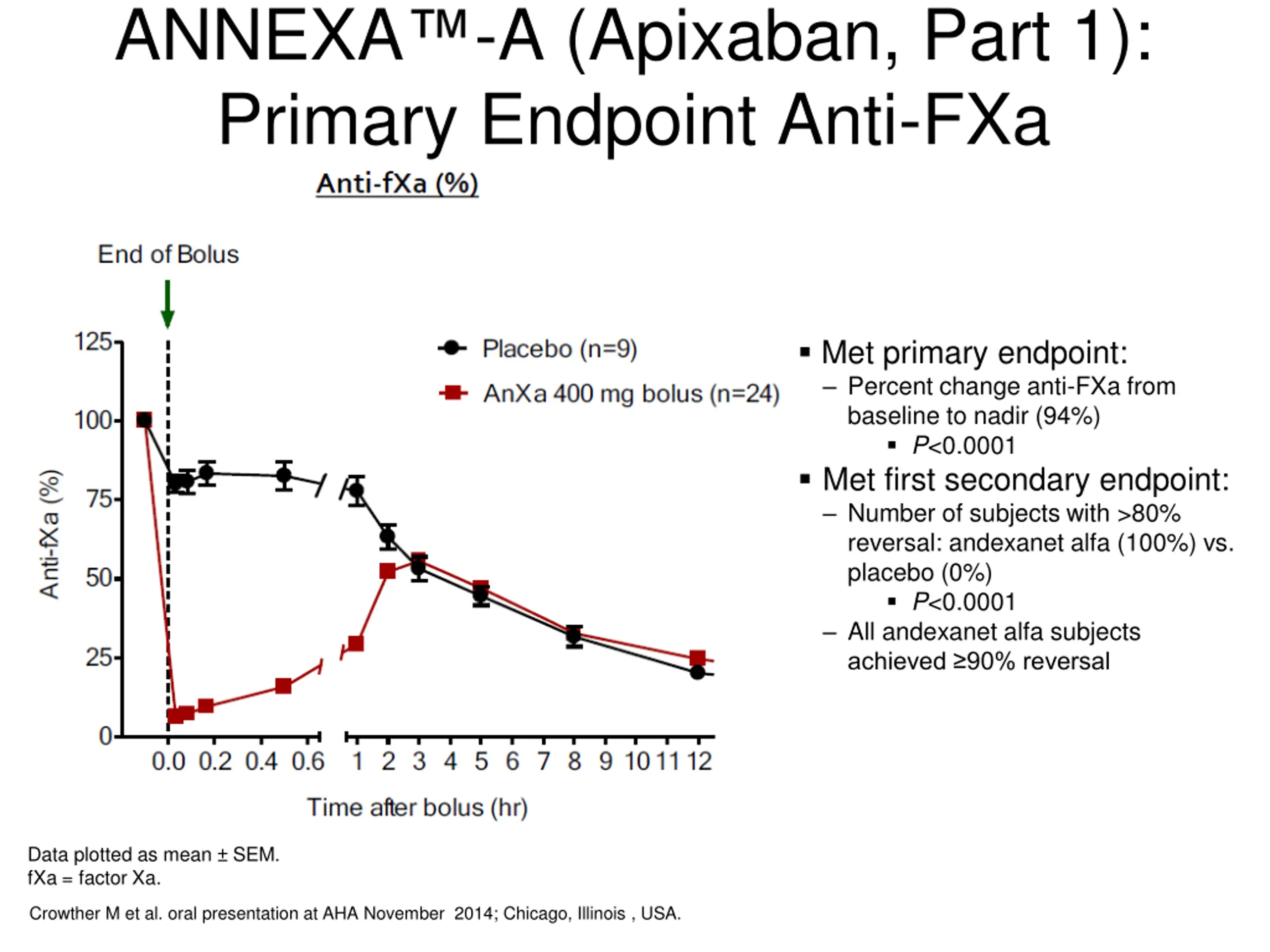 ANNEXA Primary Endpoint Anti-FXa -A (Apixaban, Part 1): Met primary endpoint: Percent change anti-FXa from baseline to nadir (94%) P<0.0001 Met first secondary endpoint: Number of subjects with >80% reversal: andexanet alfa (100%) vs. placebo (0%) P<0.0001 All andexanet alfa subjects achieved 90% reversal Data plotted as mean SEM. fXa = factor Xa. Crowther M et al. oral presentation at AHA November 2014; Chicago, Illinois , USA.