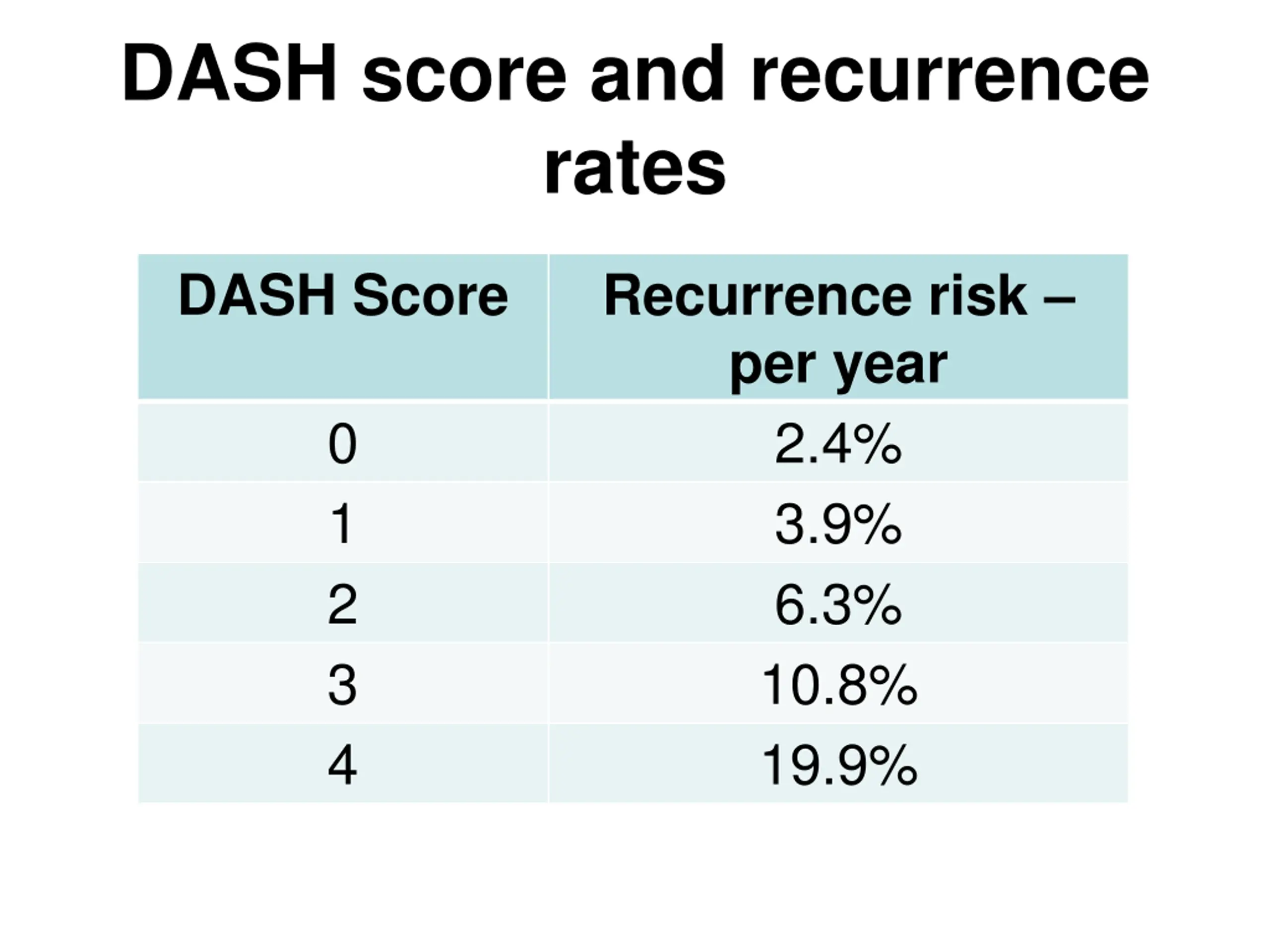 DASH score and recurrence rates DASH Score Recurrence risk per year 2.4% 3.9% 6.3% 10.8% 19.9% 0 1 2 3 4