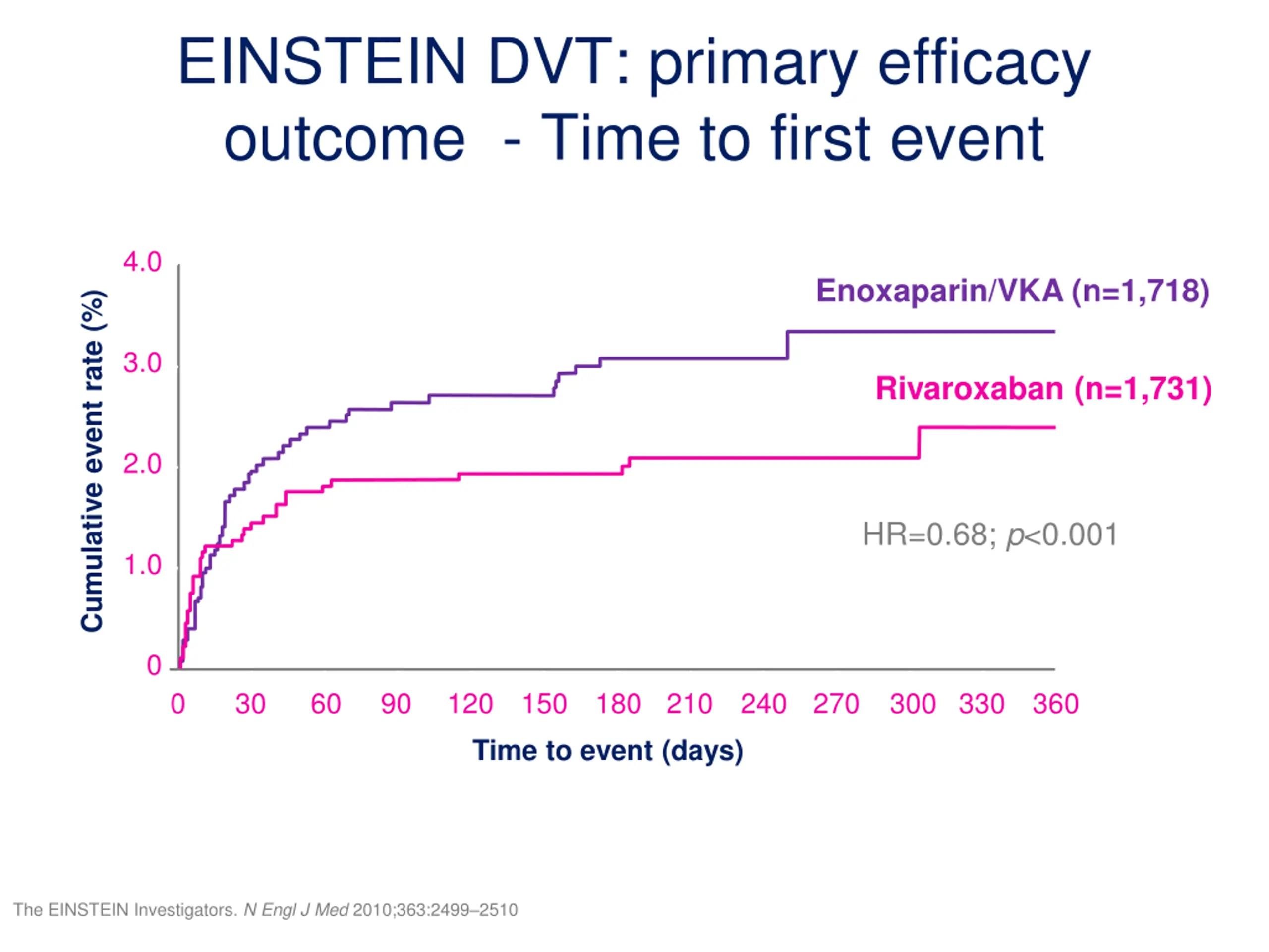 EINSTEIN DVT: primary efficacy outcome - Time to first event 4.0 Enoxaparin/VKA (n=1,718) Cumulative event rate (%) 3.0 Rivaroxaban (n=1,731) 2.0 HR=0.68; p<0.001 1.0 0 0 30 60 90 120 150 180 210 240 270 300 330 360 Time to event (days) The EINSTEIN Investigators. N Engl J Med 2010;363:2499 2510
