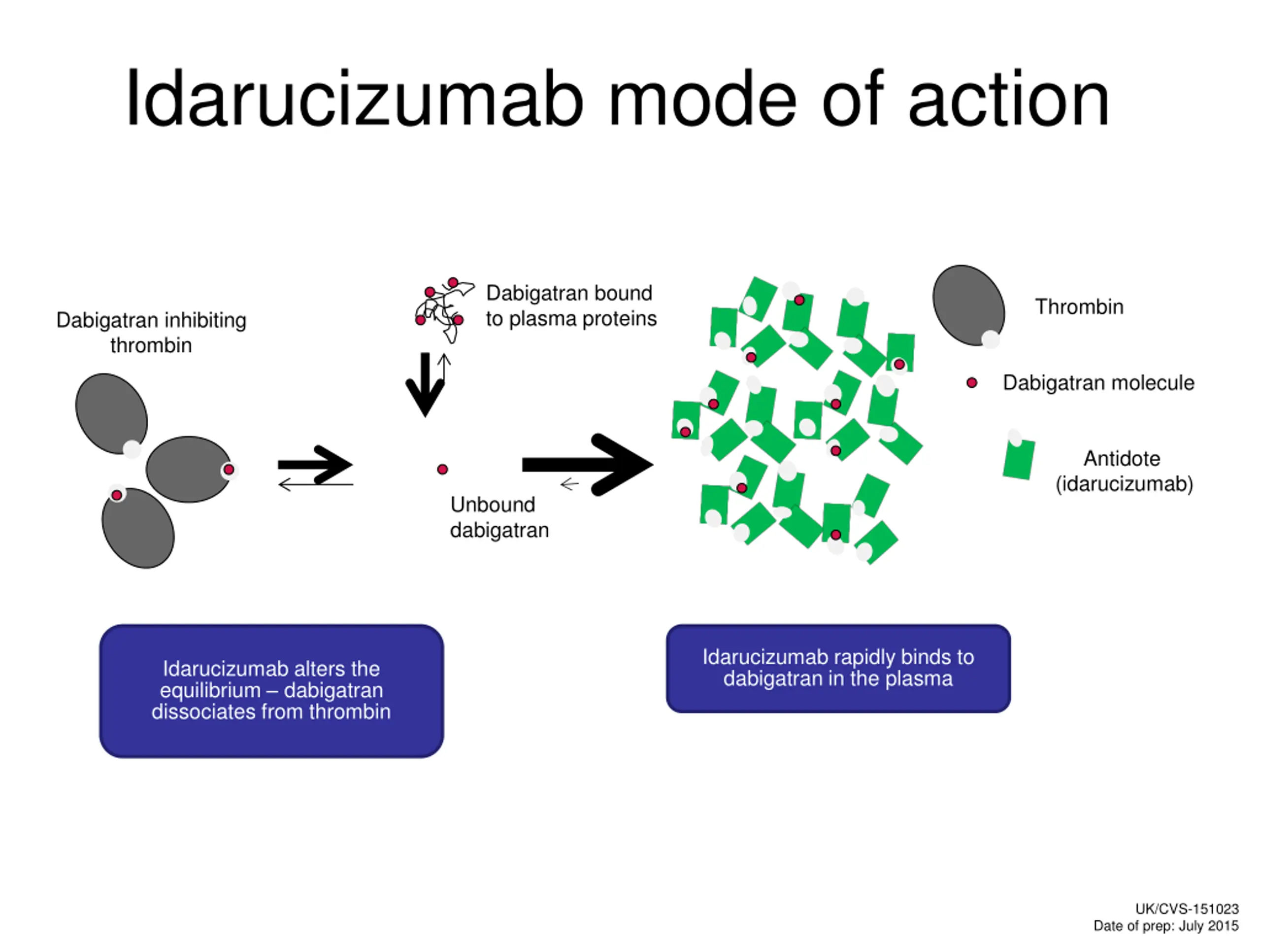 Idarucizumab mode of action Dabigatran bound to plasma proteins Thrombin Dabigatran inhibiting thrombin Dabigatran molecule Antidote (idarucizumab) Unbound dabigatran Idarucizumab rapidly binds to dabigatran in the plasma Idarucizumab alters the equilibrium dabigatran dissociates from thrombin UK/CVS-151023 Date of prep: July 2015
