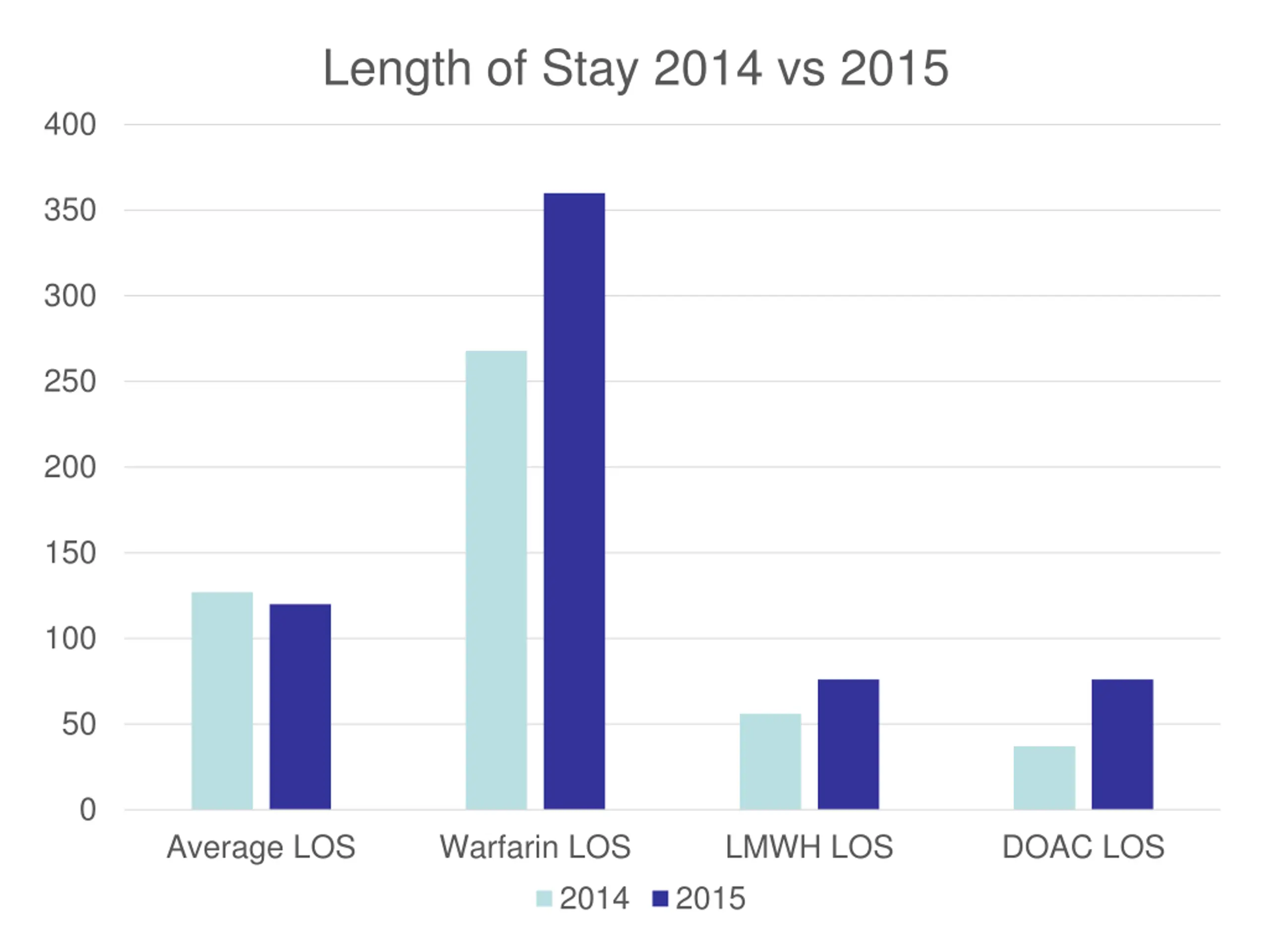 Length of Stay 2014 vs 2015 400 350 300 250 200 150 100 50 0 Average LOS Warfarin LOS LMWH LOS 2015 DOAC LOS 2014