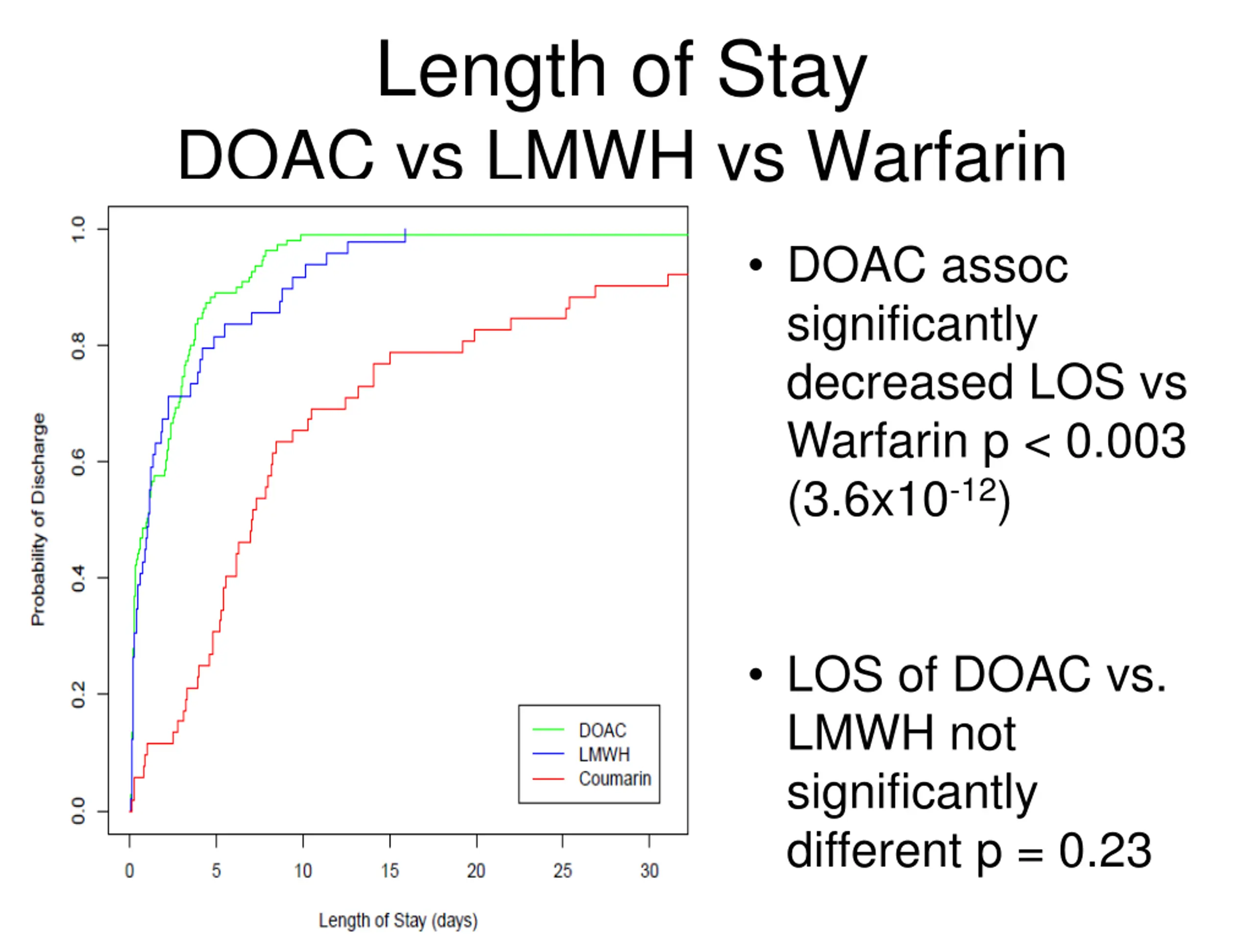 Length of Stay DOAC vs LMWH vs Warfarin DOAC assoc significantly decreased LOS vs Warfarin p < 0.003 (3.6x10-12) LOS of DOAC vs. LMWH not significantly different p = 0.23
