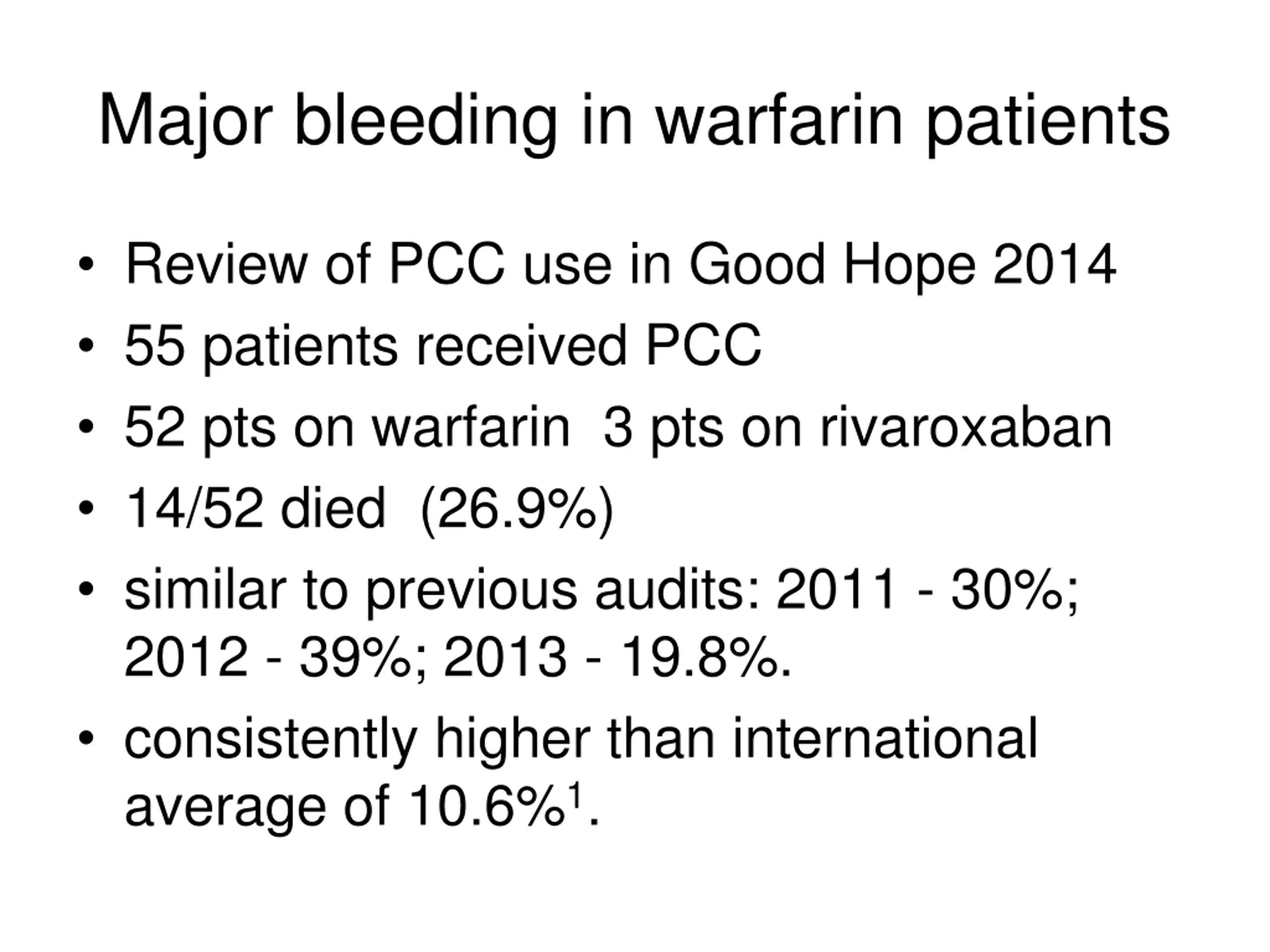 Major bleeding in warfarin patients Review of PCC use in Good Hope 2014 55 patients received PCC 52 pts on warfarin 3 pts on rivaroxaban 14/52 died (26.9%) similar to previous audits: 2011 - 30%; 2012 - 39%; 2013 - 19.8%. consistently higher than international average of 10.6%1.