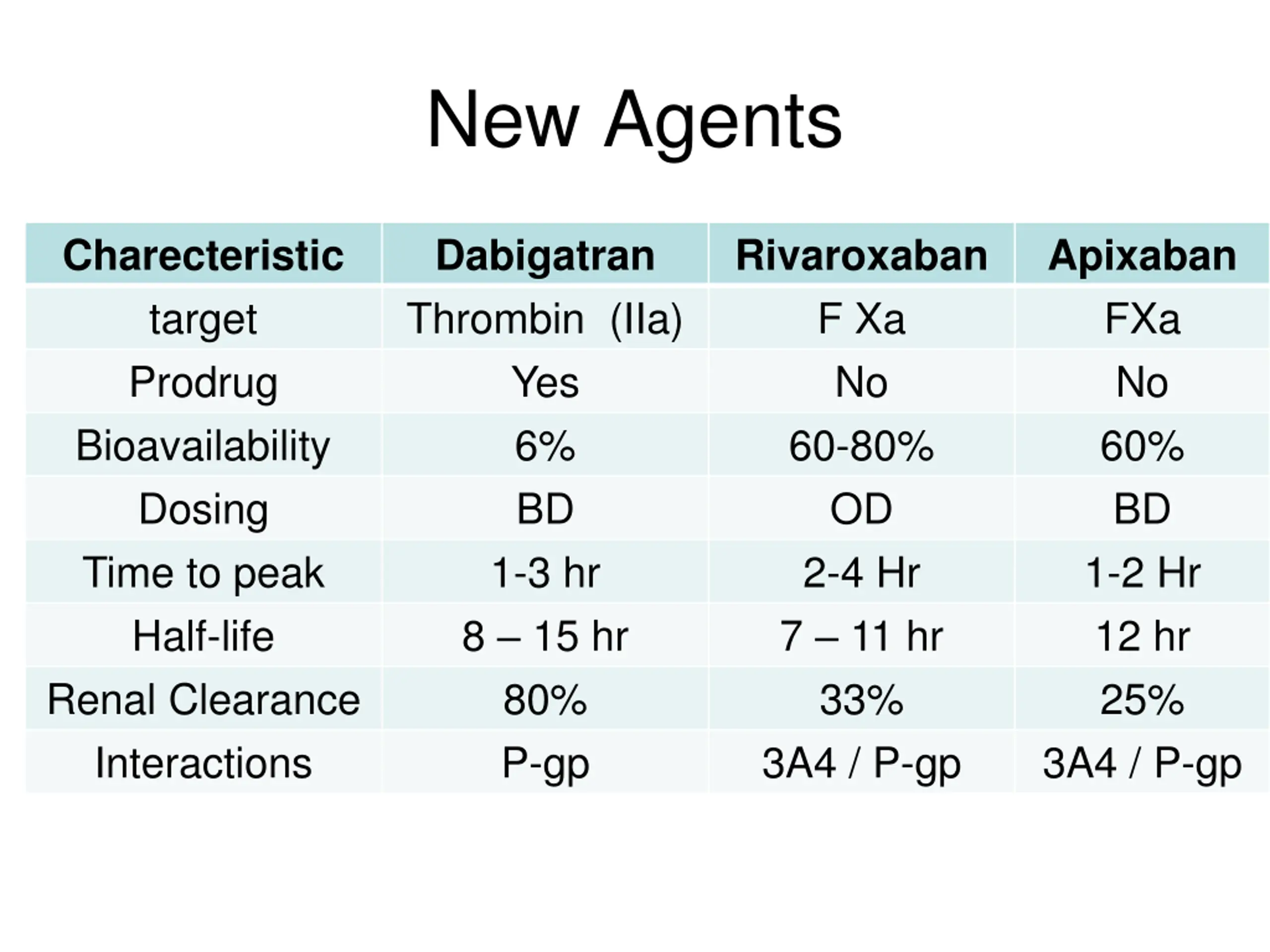 New Agents Charecteristic target Prodrug Bioavailability Dosing Time to peak Half-life Renal Clearance Interactions Dabigatran Thrombin (IIa) Yes 6% BD 1-3 hr 8 15 hr 80% P-gp Rivaroxaban F Xa No 60-80% OD 2-4 Hr 7 11 hr 33% 3A4 / P-gp Apixaban FXa No 60% BD 1-2 Hr 12 hr 25% 3A4 / P-gp