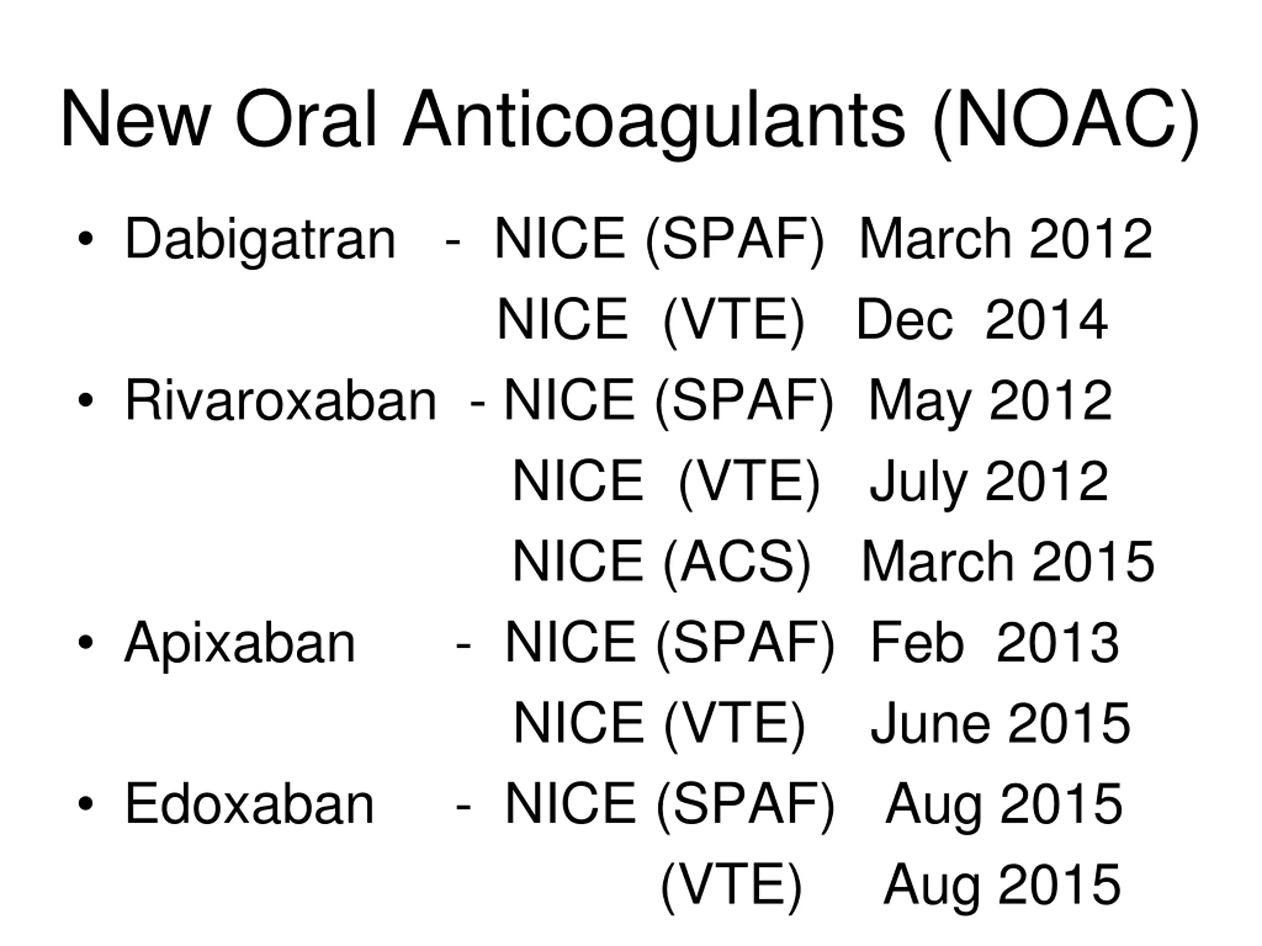 New Oral Anticoagulants (NOAC) Dabigatran - NICE (SPAF) March 2012 NICE (VTE) Dec 2014 Rivaroxaban - NICE (SPAF) May 2012 NICE (VTE) July 2012 NICE (ACS) March 2015 Apixaban - NICE (SPAF) Feb 2013 NICE (VTE) June 2015 Edoxaban - NICE (SPAF) Aug 2015 (VTE) Aug 2015