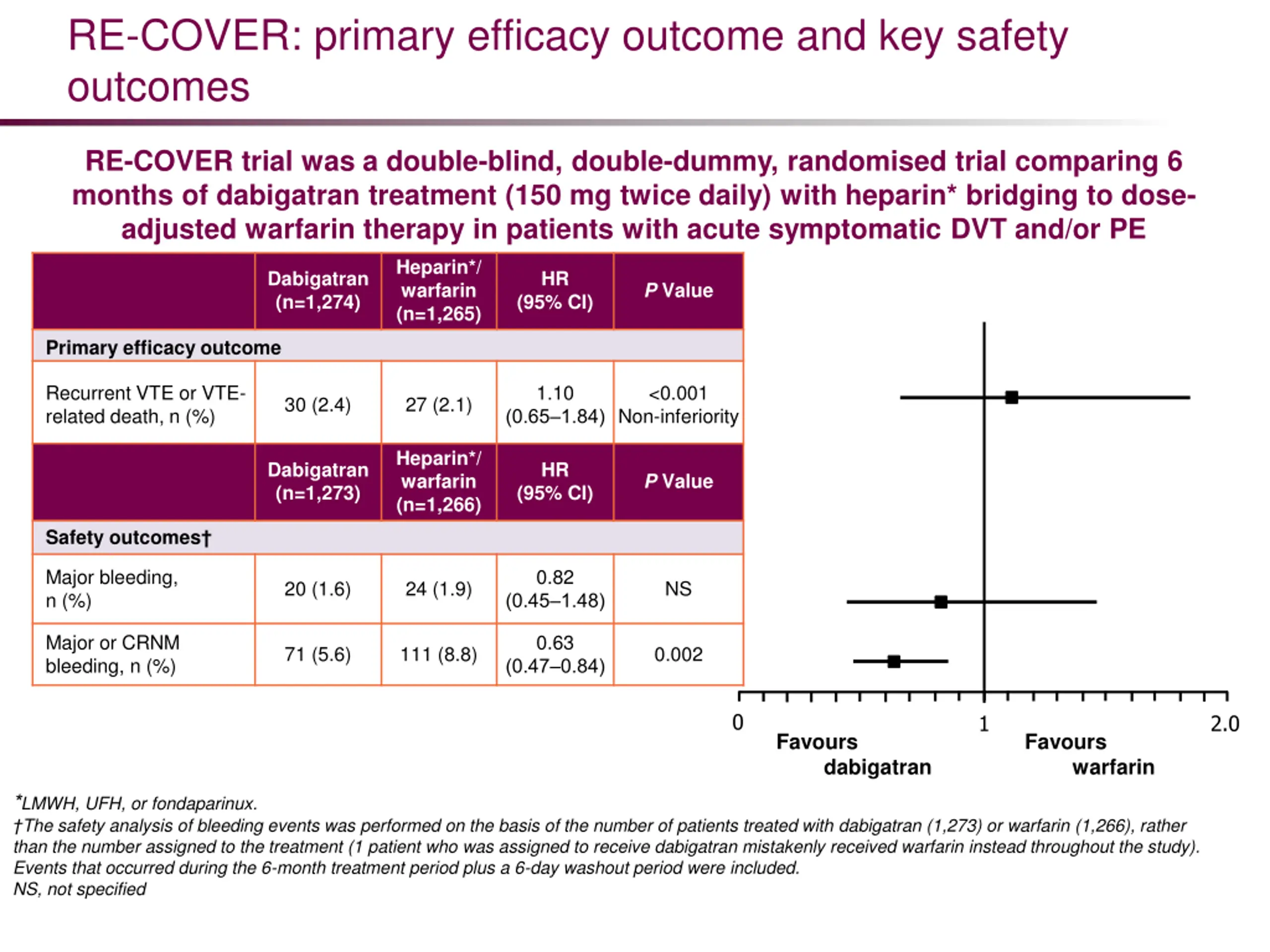 RE-COVER: primary efficacy outcome and key safety outcomes RE-COVER trial was a double-blind, double-dummy, randomised trial comparing 6 months of dabigatran treatment (150 mg twice daily) with heparin* bridging to dose- adjusted warfarin therapy in patients with acute symptomatic DVT and/or PE Heparin*/ warfarin (n=1,265) Dabigatran (n=1,274) HR P Value (95% CI) Primary efficacy outcome Recurrent VTE or VTE- related death, n (%) 1.10 <0.001 Non-inferiority 30 (2.4) 27 (2.1) (0.65 1.84) Heparin*/ warfarin (n=1,266) Dabigatran (n=1,273) HR P Value (95% CI) Safety outcomes Major bleeding, n (%) 0.82 20 (1.6) 24 (1.9) NS (0.45 1.48) Major or CRNM bleeding, n (%) 0.63 71 (5.6) 111 (8.8) 0.002 (0.47 0.84) 0 1 2.0 Favours Favours dabigatran warfarin *LMWH, UFH, or fondaparinux. The safety analysis of bleeding events was performed on the basis of the number of patients treated with dabigatran (1,273) or warfarin (1,266), rather than the number assigned to the treatment (1 patient who was assigned to receive dabigatran mistakenly received warfarin instead throughout the study). Events that occurred during the 6-month treatment period plus a 6-day washout period were included. NS, not specified ELQ771b Date of preparation: June 2015 Schulman et al. N Engl J Med. 2009;361:2342 2352.