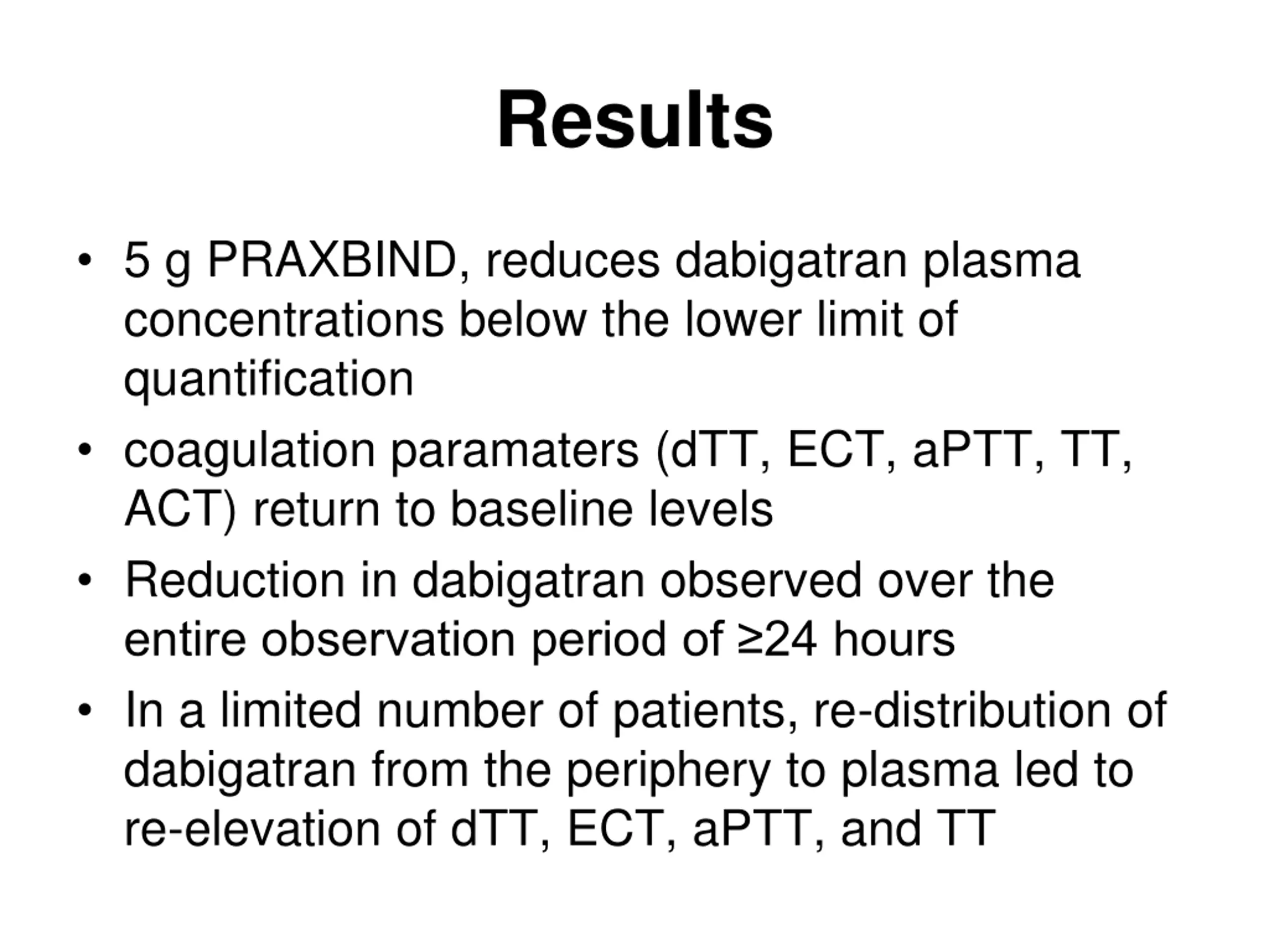Results 5 g PRAXBIND, reduces dabigatran plasma concentrations below the lower limit of quantification coagulation paramaters (dTT, ECT, aPTT, TT, ACT) return to baseline levels Reduction in dabigatran observed over the entire observation period of 24 hours In a limited number of patients, re-distribution of dabigatran from the periphery to plasma led to re-elevation of dTT, ECT, aPTT, and TT