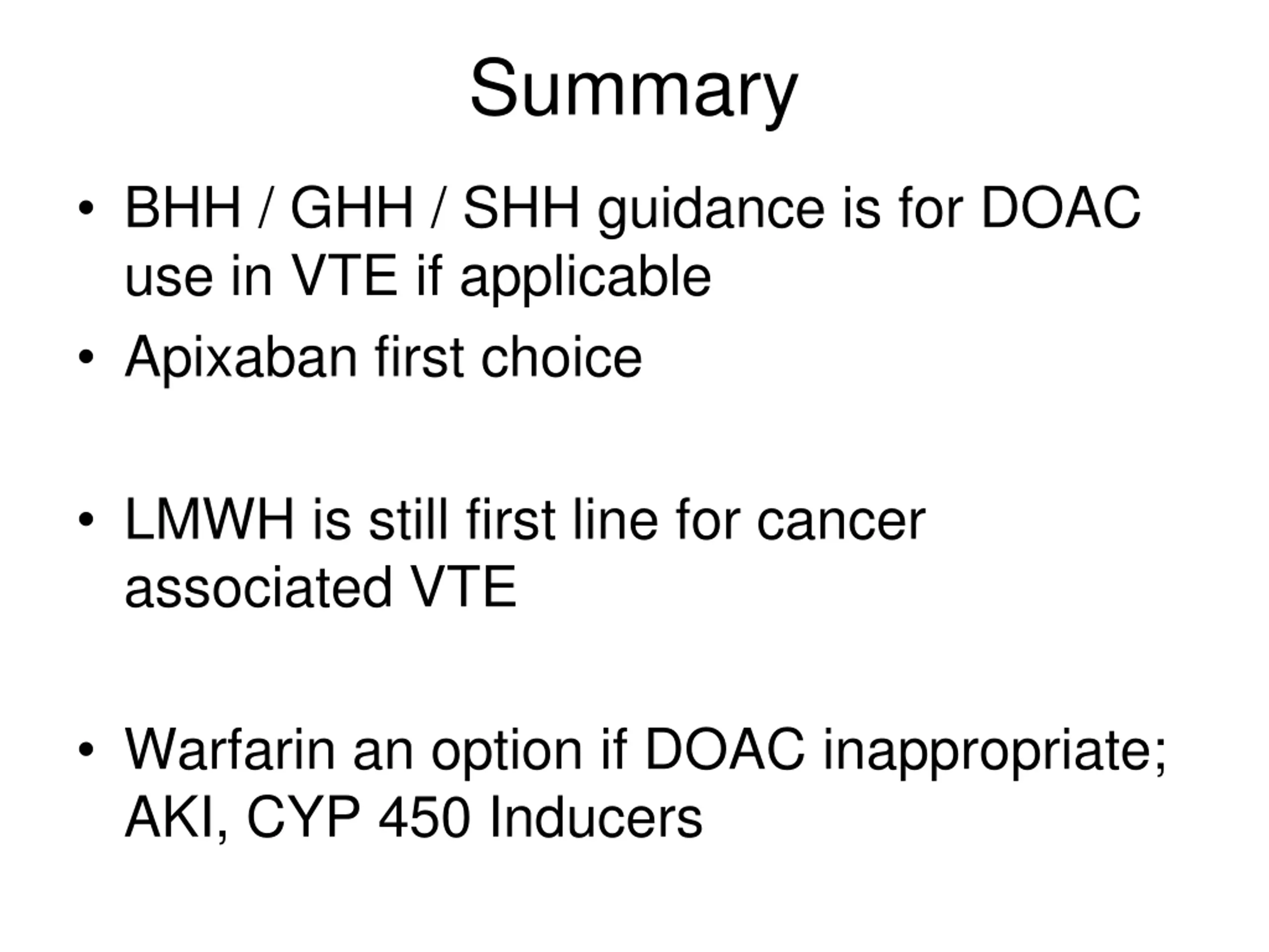 Summary BHH / GHH / SHH guidance is for DOAC use in VTE if applicable Apixaban first choice LMWH is still first line for cancer associated VTE Warfarin an option if DOAC inappropriate; AKI, CYP 450 Inducers