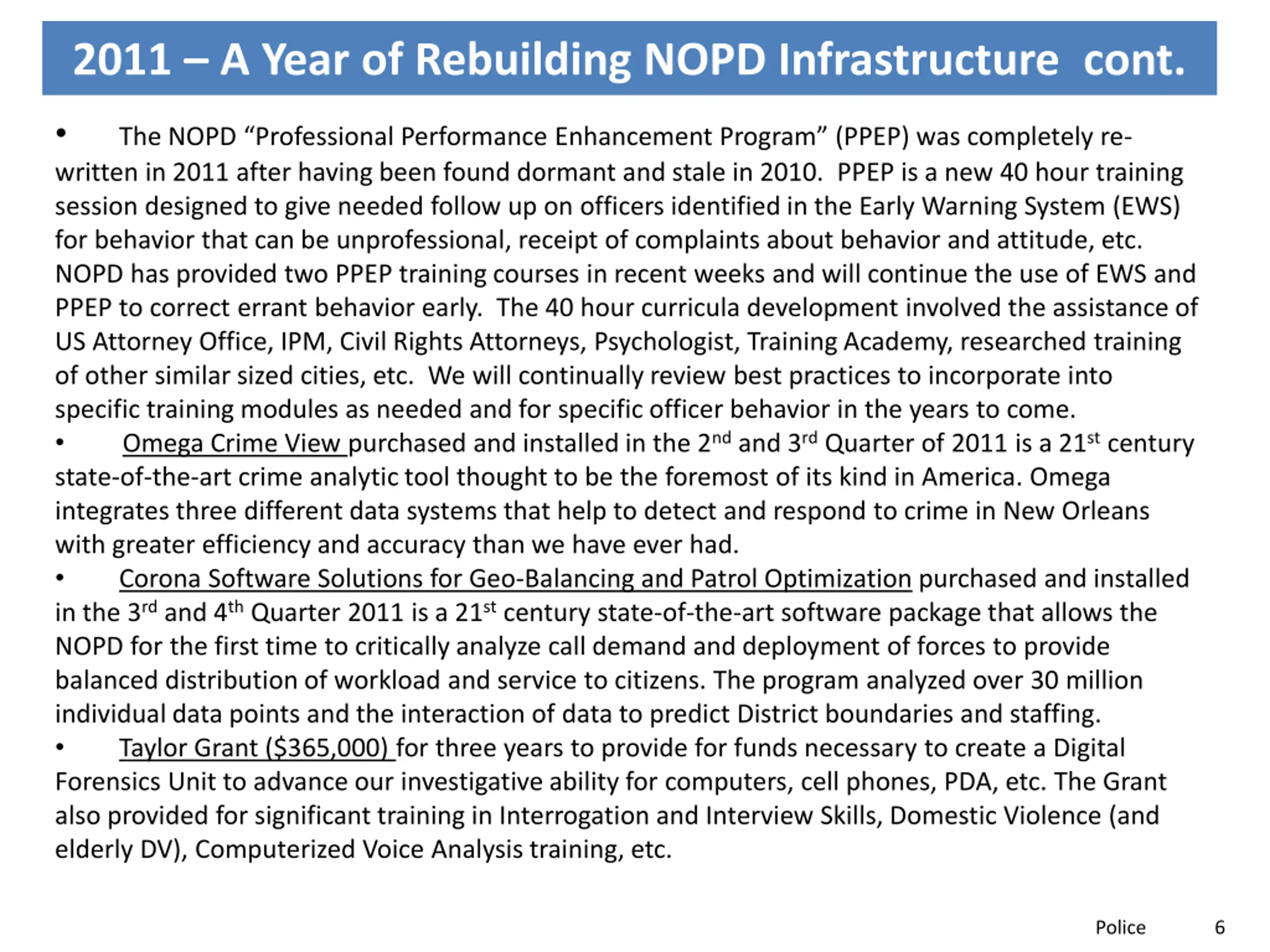 2011 A Year of Rebuilding NOPD Infrastructure cont. connect NOPD s Crime Lab to all Crime Labs in the State with 21stcentury technology. This is a $500,000 investment utilizing state funds. Central Evidence and Property Room (2011) - 100% audit of all cash in the facility revealed nearly $1.1 million dollars on hand. The cash has been transferred to specially established bank accounts. The small amount of remaining cash will be deposited before the end of 2011. This is the first 100% audit of cash on hand in the NOPD Property Room since Katrina. Lexipol Policy/Planning software selected in September 2011 providing a completely overhauled and electronic based Policy and Procedural Manual incorporating adult learning theories, nationwide best practices, changes we will make resulting from the Consent Decree, and provides a six minute Daily Training Bullets which will significantly enhance employee performance and knowledge. It will also reduce the cost of our Policy and Planning Unit. Our Public Integrity Bureau has led many investigations resulting in (since May 2010) 26 employees resigning or retiring while under investigation, including police officers to deputy chief, and 17 employees being dismissed for misconduct ranging in rank from officer to police captain. In September 2011, the NOPD in partnership with the FBI, housed two FBI Agents within PIB. These agents are part of our investigative strategy and have unrestricted access to PIB leadership to coordinate and monitor any PIB investigation. FBI Agents will also deliver instruction on Civil Rights and law enforcement to employees. In 2011 PIB is currently on pace to complete 170 Integrity Checks, which was below our target of 240 for 2011. However what is noteworthy and is a success for 2011 is that there were no Integrity Checks for Jan-Aug 2010, and 40 checks between Jun-Dec 2010. The investigations PIB had to undertake following the Glover and the Danziger cases significantly impacted its ability to conduct integrity checks. A Laboratory Information Management Systems vendor was selected in October. This will Police 5
