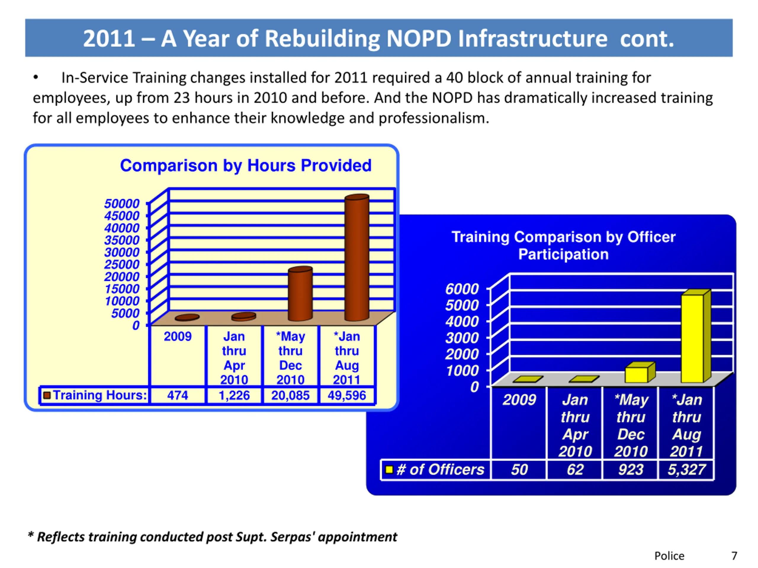 2011 A Year of Rebuilding NOPD Infrastructure cont. written in 2011 after having been found dormant and stale in 2010. PPEP is a new 40 hour training session designed to give needed follow up on officers identified in the Early Warning System (EWS) for behavior that can be unprofessional, receipt of complaints about behavior and attitude, etc. NOPD has provided two PPEP training courses in recent weeks and will continue the use of EWS and PPEP to correct errant behavior early. The 40 hour curricula development involved the assistance of US Attorney Office, IPM, Civil Rights Attorneys, Psychologist, Training Academy, researched training of other similar sized cities, etc. We will continually review best practices to incorporate into specific training modules as needed and for specific officer behavior in the years to come. Omega Crime View purchased and installed in the 2nd and 3rd Quarter of 2011 is a 21st century state-of-the-art crime analytic tool thought to be the foremost of its kind in America. Omega integrates three different data systems that help to detect and respond to crime in New Orleans with greater efficiency and accuracy than we have ever had. Corona Software Solutions for Geo-Balancing and Patrol Optimization purchased and installed in the 3rd and 4th Quarter 2011 is a 21st century state-of-the-art software package that allows the NOPD for the first time to critically analyze call demand and deployment of forces to provide balanced distribution of workload and service to citizens. The program analyzed over 30 million individual data points and the interaction of data to predict District boundaries and staffing. Taylor Grant ($365,000) for three years to provide for funds necessary to create a Digital Forensics Unit to advance our investigative ability for computers, cell phones, PDA, etc. The Grant also provided for significant training in Interrogation and Interview Skills, Domestic Violence (and elderly DV), Computerized Voice Analysis training, etc. The NOPD Professional Performance Enhancement Program (PPEP) was completely re- Police 6