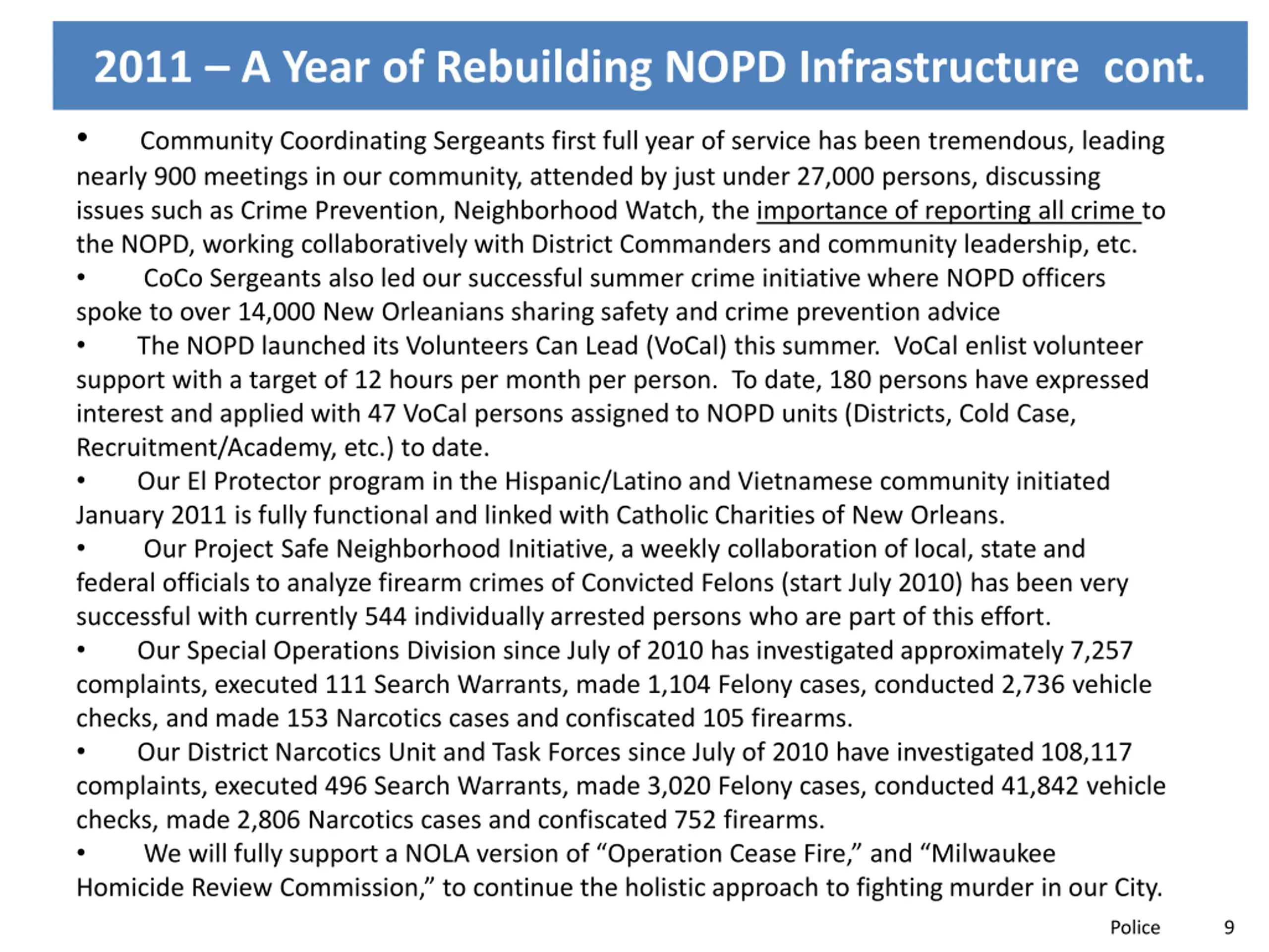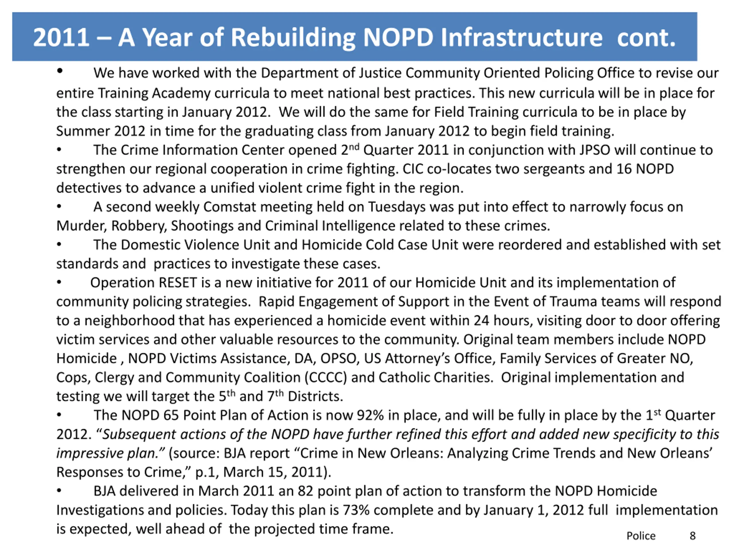 2011 A Year of Rebuilding NOPD Infrastructure cont. entire Training Academy curricula to meet national best practices. This new curricula will be in place for the class starting in January 2012. We will do the same for Field Training curricula to be in place by Summer 2012 in time for the graduating class from January 2012 to begin field training. The Crime Information Center opened 2nd Quarter 2011 in conjunction with JPSO will continue to strengthen our regional cooperation in crime fighting. CIC co-locates two sergeants and 16 NOPD detectives to advance a unified violent crime fight in the region. A second weekly Comstat meeting held on Tuesdays was put into effect to narrowly focus on Murder, Robbery, Shootings and Criminal Intelligence related to these crimes. The Domestic Violence Unit and Homicide Cold Case Unit were reordered and established with set standards and practices to investigate these cases. Operation RESET is a new initiative for 2011 of our Homicide Unit and its implementation of community policing strategies. Rapid Engagement of Support in the Event of Trauma teams will respond to a neighborhood that has experienced a homicide event within 24 hours, visiting door to door offering victim services and other valuable resources to the community. Original team members include NOPD Homicide , NOPD Victims Assistance, DA, OPSO, US Attorney s Office, Family Services of Greater NO, Cops, Clergy and Community Coalition (CCCC) and Catholic Charities. Original implementation and testing we will target the 5th and 7th Districts. The NOPD 65 Point Plan of Action is now 92% in place, and will be fully in place by the 1st Quarter 2012. Subsequent actions of the NOPD have further refined this effort and added new specificity to this impressive plan. (source: BJA report Crime in New Orleans: Analyzing Crime Trends and New Orleans Responses to Crime, p.1, March 15, 2011). BJA delivered in March 2011 an 82 point plan of action to transform the NOPD Homicide Investigations and policies. Today this plan is 73% complete and by January 1, 2012 full implementation is expected, well ahead of the projected time frame. We have worked with the Department of Justice Community Oriented Policing Office to revise our Police 8