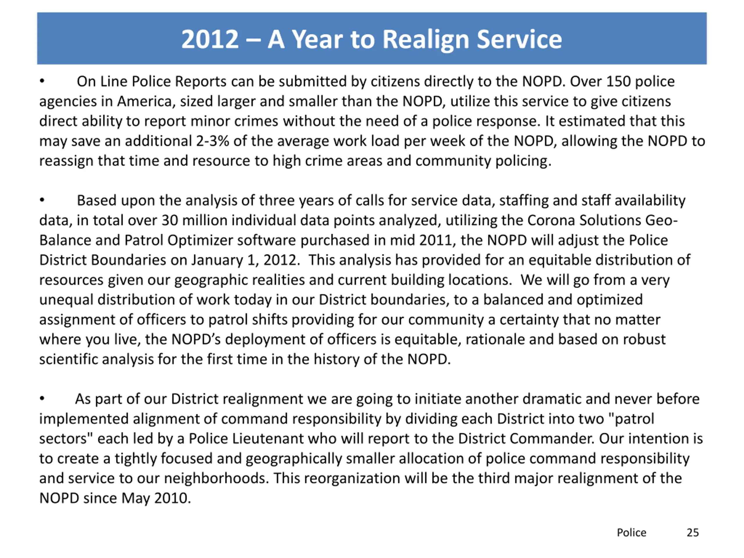 2012 A Year to Realign Service agencies in America, sized larger and smaller than the NOPD, utilize this service to give citizens direct ability to report minor crimes without the need of a police response. It estimated that this may save an additional 2-3% of the average work load per week of the NOPD, allowing the NOPD to reassign that time and resource to high crime areas and community policing. On Line Police Reports can be submitted by citizens directly to the NOPD. Over 150 police data, in total over 30 million individual data points analyzed, utilizing the Corona Solutions Geo- Balance and Patrol Optimizer software purchased in mid 2011, the NOPD will adjust the Police District Boundaries on January 1, 2012. This analysis has provided for an equitable distribution of resources given our geographic realities and current building locations. We will go from a very unequal distribution of work today in our District boundaries, to a balanced and optimized assignment of officers to patrol shifts providing for our community a certainty that no matter where you live, the NOPD s deployment of officers is equitable, rationale and based on robust scientific analysis for the first time in the history of the NOPD. As part of our District realignment we are going to initiate another dramatic and never before implemented alignment of command responsibility by dividing each District into two "patrol sectors" each led by a Police Lieutenant who will report to the District Commander. Our intention is to create a tightly focused and geographically smaller allocation of police command responsibility and service to our neighborhoods. This reorganization will be the third major realignment of the NOPD since May 2010. Based upon the analysis of three years of calls for service data, staffing and staff availability Police 25