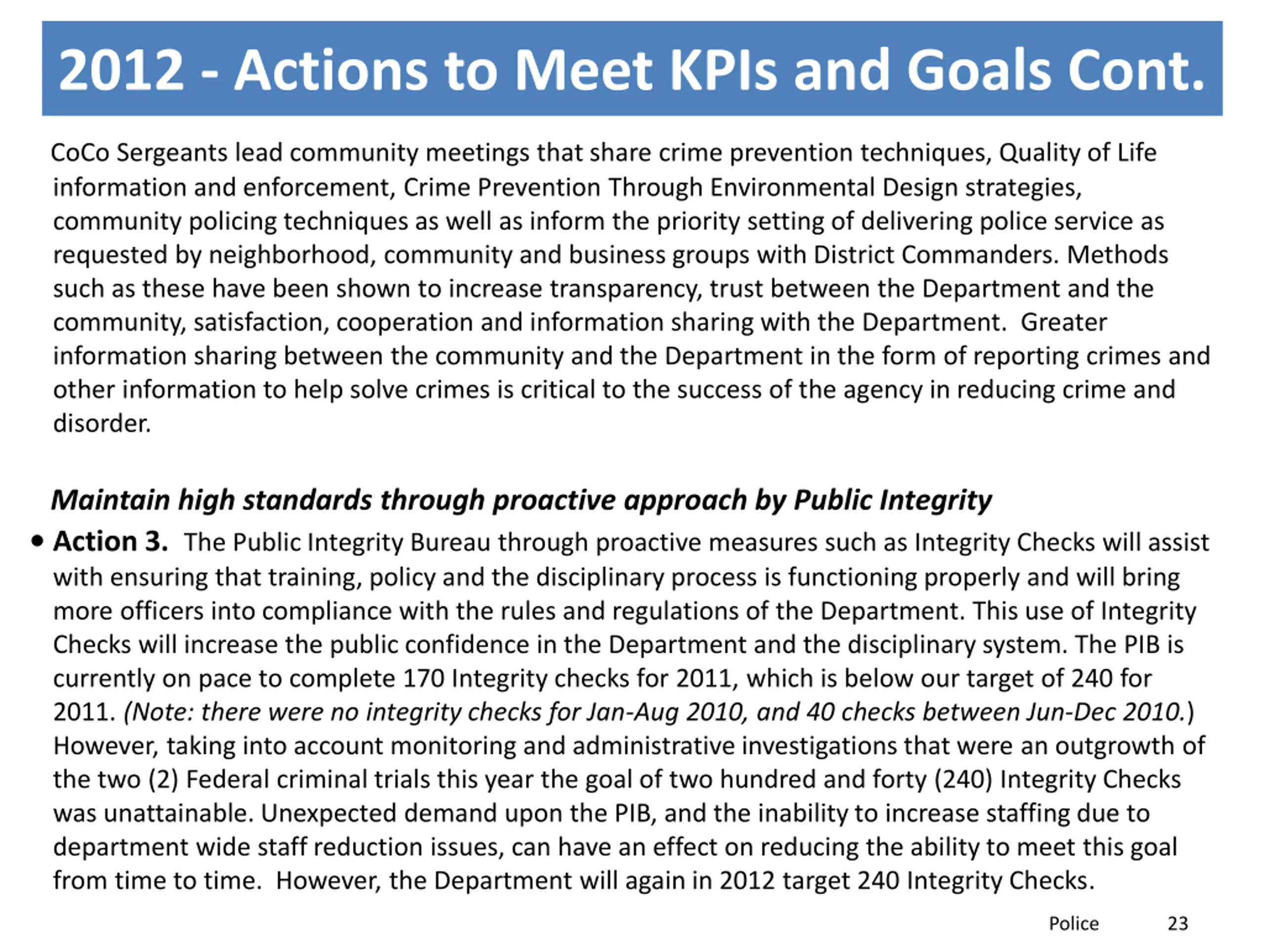 2012 - Actions to Meet KPIs and Goals Cont. CoCo Sergeants lead community meetings that share crime prevention techniques, Quality of Life information and enforcement, Crime Prevention Through Environmental Design strategies, community policing techniques as well as inform the priority setting of delivering police service as requested by neighborhood, community and business groups with District Commanders. Methods such as these have been shown to increase transparency, trust between the Department and the community, satisfaction, cooperation and information sharing with the Department. Greater information sharing between the community and the Department in the form of reporting crimes and other information to help solve crimes is critical to the success of the agency in reducing crime and disorder. Maintain high standards through proactive approach by Public Integrity Action 3. The Public Integrity Bureau through proactive measures such as Integrity Checks will assist with ensuring that training, policy and the disciplinary process is functioning properly and will bring more officers into compliance with the rules and regulations of the Department. This use of Integrity Checks will increase the public confidence in the Department and the disciplinary system. The PIB is currently on pace to complete 170 Integrity checks for 2011, which is below our target of 240 for 2011. (Note: there were no integrity checks for Jan-Aug 2010, and 40 checks between Jun-Dec 2010.) However, taking into account monitoring and administrative investigations that were an outgrowth of the two (2) Federal criminal trials this year the goal of two hundred and forty (240) Integrity Checks was unattainable. Unexpected demand upon the PIB, and the inability to increase staffing due to department wide staff reduction issues, can have an effect on reducing the ability to meet this goal from time to time. However, the Department will again in 2012 target 240 Integrity Checks. Police 23