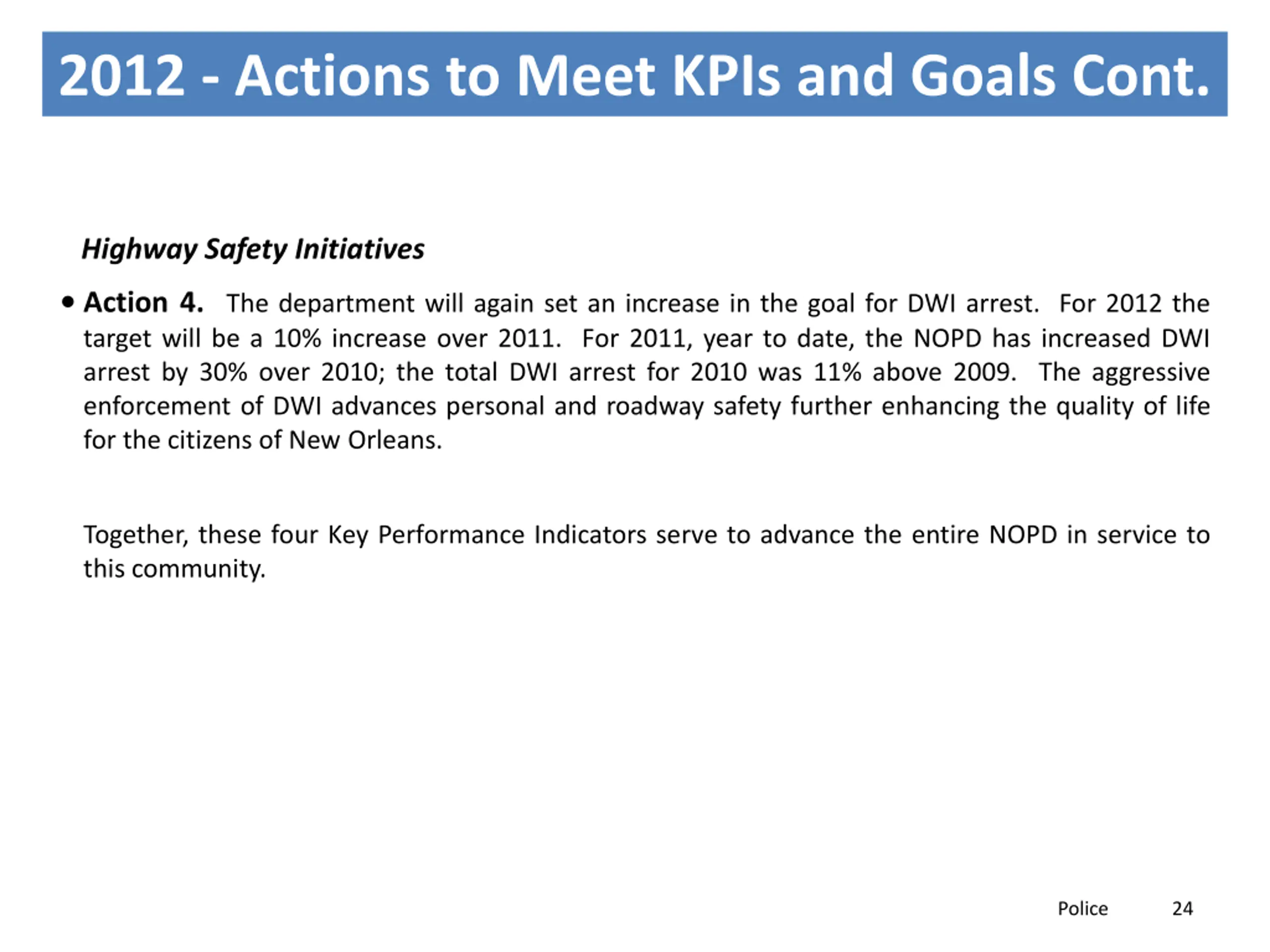 2012 - Actions to Meet KPIs and Goals Cont. Highway Safety Initiatives Action 4. The department will again set an increase in the goal for DWI arrest. For 2012 the target will be a 10% increase over 2011. For 2011, year to date, the NOPD has increased DWI arrest by 30% over 2010; the total DWI arrest for 2010 was 11% above 2009. The aggressive enforcement of DWI advances personal and roadway safety further enhancing the quality of life for the citizens of New Orleans. Together, these four Key Performance Indicators serve to advance the entire NOPD in service to this community. Police 24