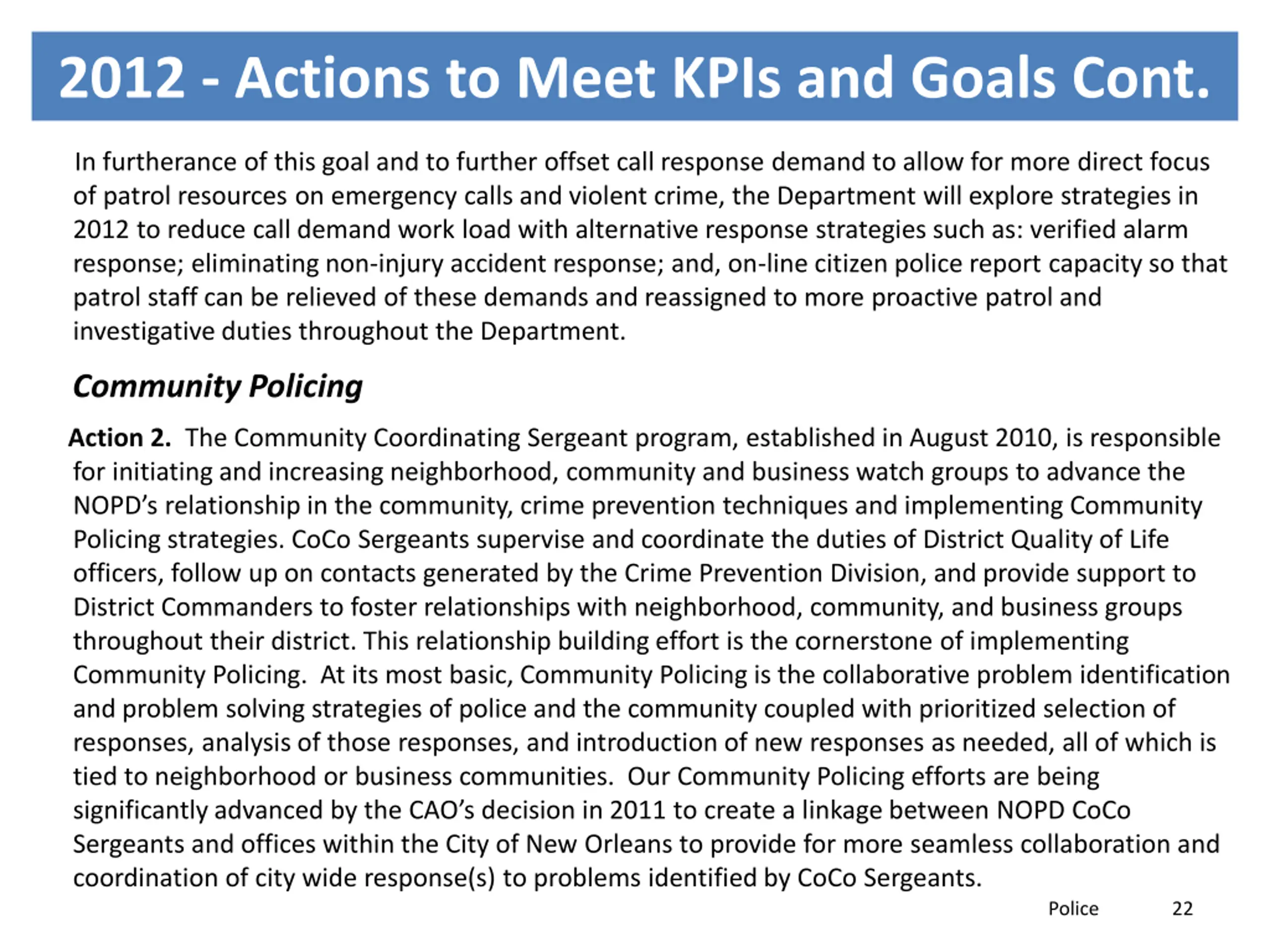 2012 - Actions to Meet KPIs and Goals Cont. In furtherance of this goal and to further offset call response demand to allow for more direct focus of patrol resources on emergency calls and violent crime, the Department will explore strategies in 2012 to reduce call demand work load with alternative response strategies such as: verified alarm response; eliminating non-injury accident response; and, on-line citizen police report capacity so that patrol staff can be relieved of these demands and reassigned to more proactive patrol and investigative duties throughout the Department. Community Policing Action 2. The Community Coordinating Sergeant program, established in August 2010, is responsible for initiating and increasing neighborhood, community and business watch groups to advance the NOPD s relationship in the community, crime prevention techniques and implementing Community Policing strategies. CoCo Sergeants supervise and coordinate the duties of District Quality of Life officers, follow up on contacts generated by the Crime Prevention Division, and provide support to District Commanders to foster relationships with neighborhood, community, and business groups throughout their district. This relationship building effort is the cornerstone of implementing Community Policing. At its most basic, Community Policing is the collaborative problem identification and problem solving strategies of police and the community coupled with prioritized selection of responses, analysis of those responses, and introduction of new responses as needed, all of which is tied to neighborhood or business communities. Our Community Policing efforts are being significantly advanced by the CAO s decision in 2011 to create a linkage between NOPD CoCo Sergeants and offices within the City of New Orleans to provide for more seamless collaboration and coordination of city wide response(s) to problems identified by CoCo Sergeants. Police 22