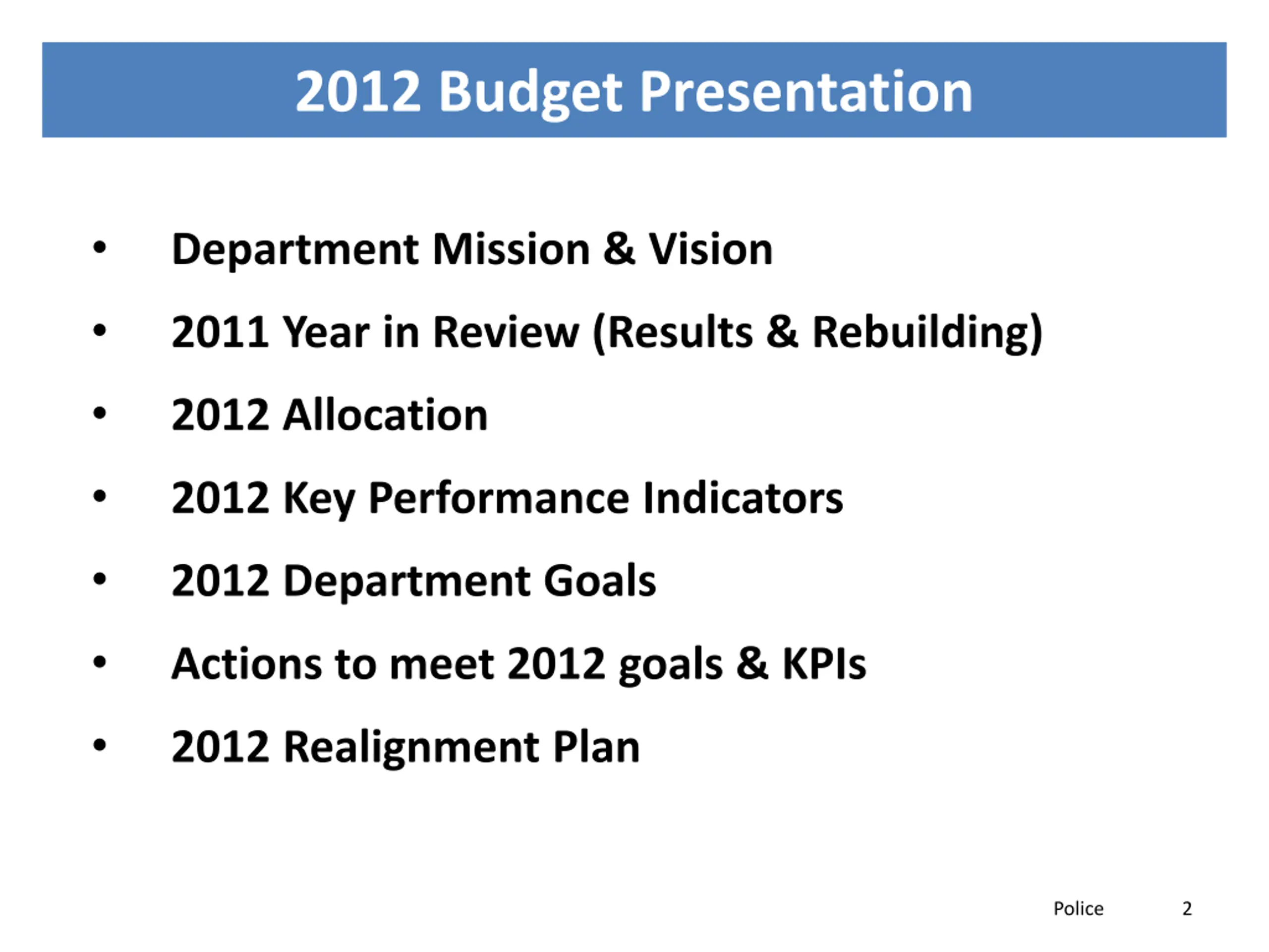2012 Budget Presentation Department Mission & Vision 2011 Year in Review (Results & Rebuilding) 2012 Allocation 2012 Key Performance Indicators 2012 Department Goals Actions to meet 2012 goals & KPIs 2012 Realignment Plan Police 2