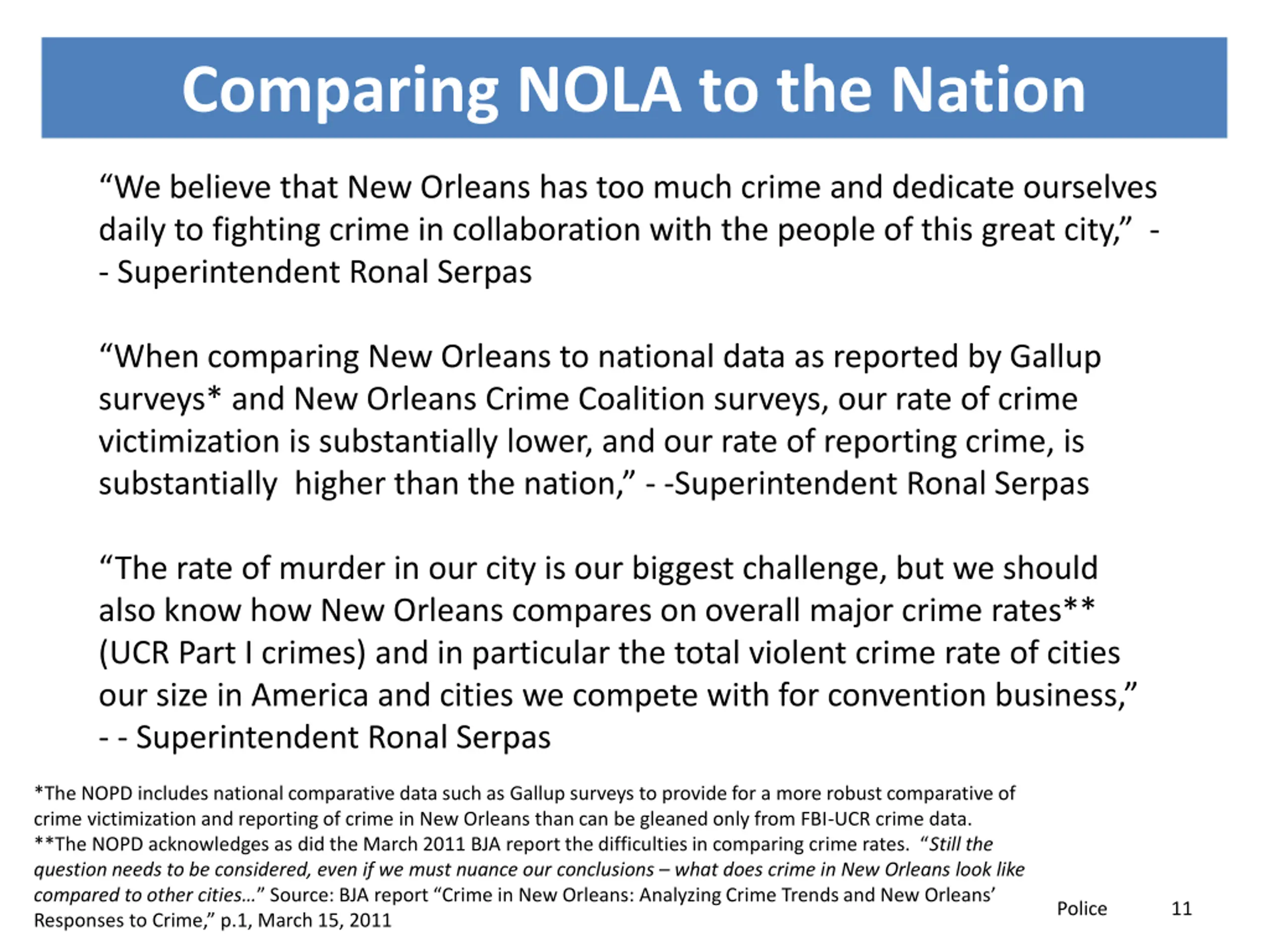 Comparing NOLA to the Nation We believe that New Orleans has too much crime and dedicate ourselves daily to fighting crime in collaboration with the people of this great city, - - Superintendent Ronal Serpas When comparing New Orleans to national data as reported by Gallup surveys* and New Orleans Crime Coalition surveys, our rate of crime victimization is substantially lower, and our rate of reporting crime, is substantially higher than the nation, - -Superintendent Ronal Serpas The rate of murder in our city is our biggest challenge, but we should also know how New Orleans compares on overall major crime rates** (UCR Part I crimes) and in particular the total violent crime rate of cities our size in America and cities we compete with for convention business, - - Superintendent Ronal Serpas *The NOPD includes national comparative data such as Gallup surveys to provide for a more robust comparative of crime victimization and reporting of crime in New Orleans than can be gleaned only from FBI-UCR crime data. **The NOPD acknowledges as did the March 2011 BJA report the difficulties in comparing crime rates. Still the question needs to be considered, even if we must nuance our conclusions what does crime in New Orleans look like compared to other cities Source: BJA report Crime in New Orleans: Analyzing Crime Trends and New Orleans Responses to Crime, p.1, March 15, 2011 Police 11