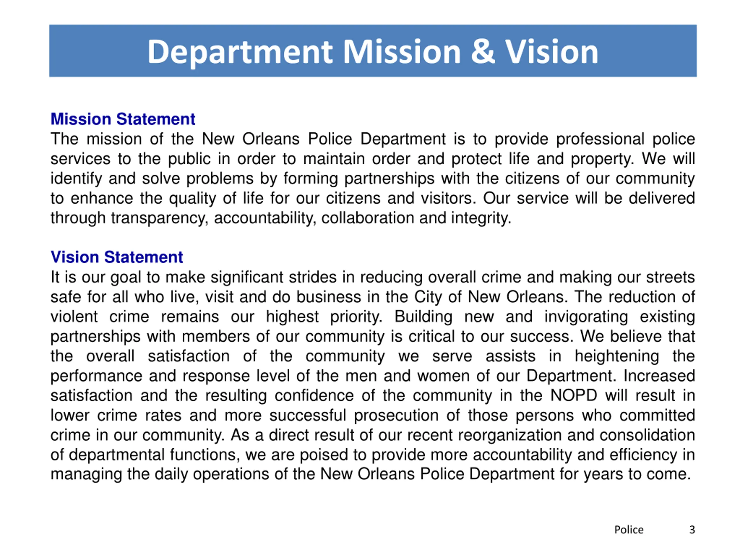 Department Mission & Vision Mission Statement The mission of the New Orleans Police Department is to provide professional police services to the public in order to maintain order and protect life and property. We will identify and solve problems by forming partnerships with the citizens of our community to enhance the quality of life for our citizens and visitors. Our service will be delivered through transparency, accountability, collaboration and integrity. Vision Statement It is our goal to make significant strides in reducing overall crime and making our streets safe for all who live, visit and do business in the City of New Orleans. The reduction of violent crime remains our highest priority. Building new and invigorating existing partnerships with members of our community is critical to our success. We believe that the overall satisfaction of the community we serve assists in heightening the performance and response level of the men and women of our Department. Increased satisfaction and the resulting confidence of the community in the NOPD will result in lower crime rates and more successful prosecution of those persons who committed crime in our community. As a direct result of our recent reorganization and consolidation of departmental functions, we are poised to provide more accountability and efficiency in managing the daily operations of the New Orleans Police Department for years to come. Police 3