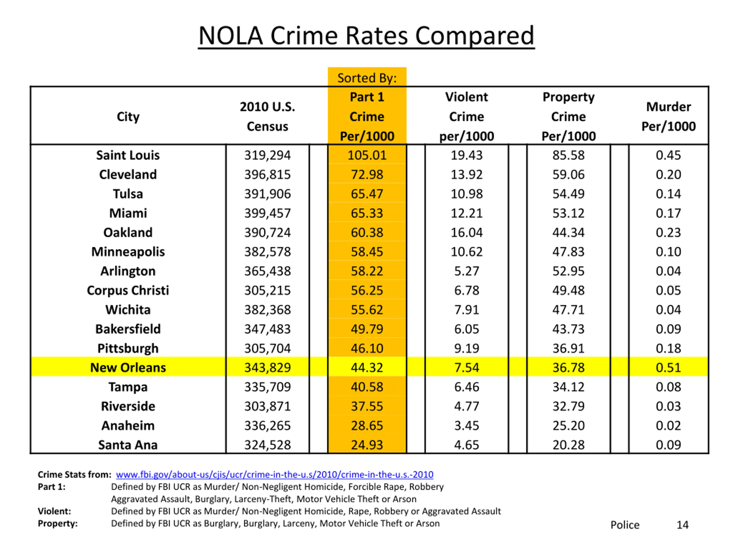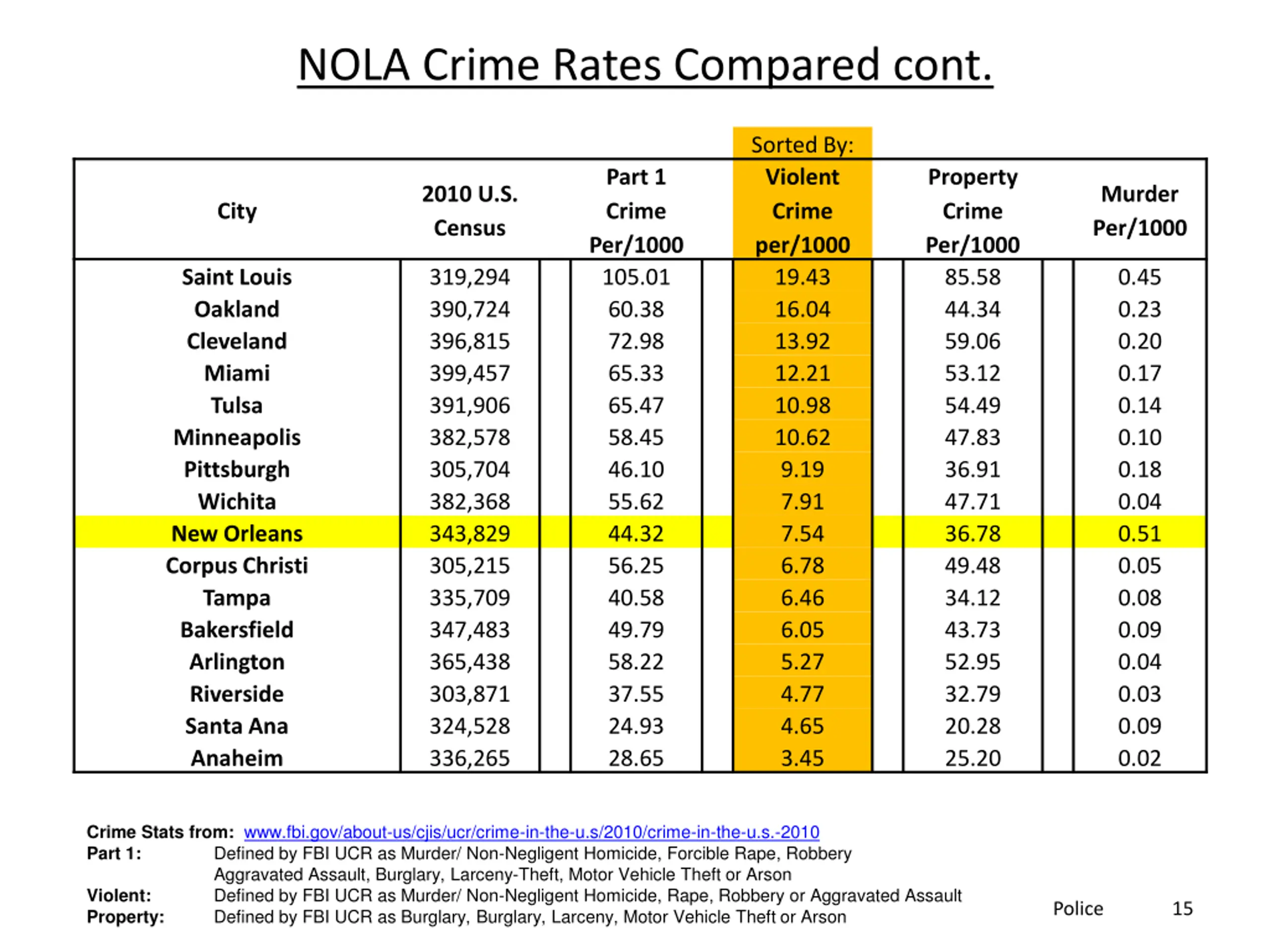 NOLA Crime Rates Compared Sorted By: Part 1 Crime Per/1000 105.01 72.98 65.47 65.33 60.38 58.45 58.22 56.25 55.62 49.79 46.10 44.32 40.58 37.55 28.65 24.93 Violent Crime per/1000 19.43 13.92 10.98 12.21 16.04 10.62 5.27 6.78 7.91 6.05 9.19 7.54 6.46 4.77 3.45 4.65 Property Crime Per/1000 85.58 59.06 54.49 53.12 44.34 47.83 52.95 49.48 47.71 43.73 36.91 36.78 34.12 32.79 25.20 20.28 2010 U.S. Census Murder Per/1000 City Saint Louis Cleveland Tulsa Miami Oakland Minneapolis Arlington Corpus Christi Wichita Bakersfield Pittsburgh New Orleans Tampa Riverside Anaheim Santa Ana 319,294 396,815 391,906 399,457 390,724 382,578 365,438 305,215 382,368 347,483 305,704 343,829 335,709 303,871 336,265 324,528 0.45 0.20 0.14 0.17 0.23 0.10 0.04 0.05 0.04 0.09 0.18 0.51 0.08 0.03 0.02 0.09 Crime Stats from: www.fbi.gov/about-us/cjis/ucr/crime-in-the-u.s/2010/crime-in-the-u.s.-2010 Part 1: Defined by FBI UCR as Murder/ Non-Negligent Homicide, Forcible Rape, Robbery Aggravated Assault, Burglary, Larceny-Theft, Motor Vehicle Theft or Arson Violent: Defined by FBI UCR as Murder/ Non-Negligent Homicide, Rape, Robbery or Aggravated Assault Property: Defined by FBI UCR as Burglary, Burglary, Larceny, Motor Vehicle Theft or Arson Police 14