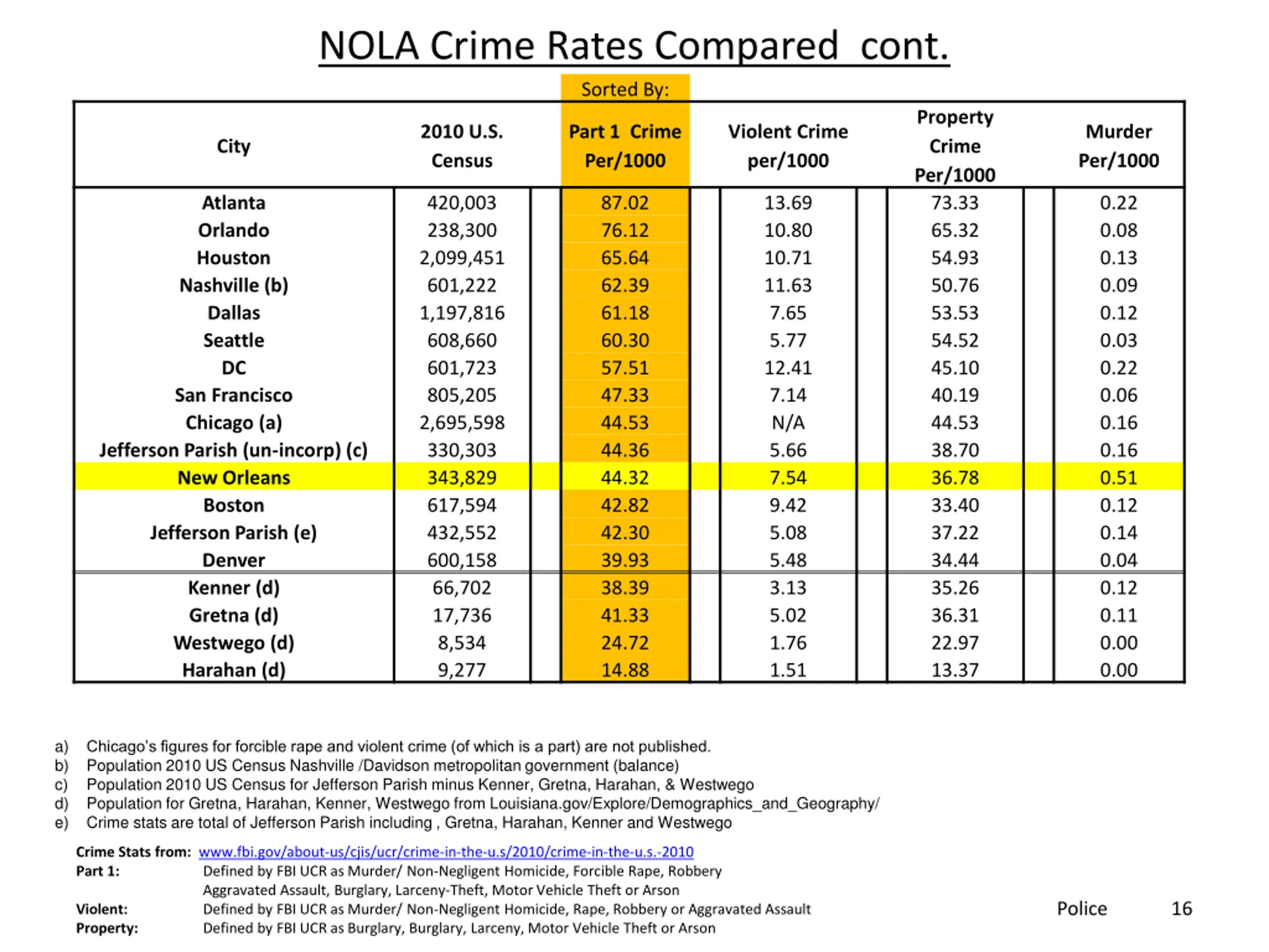 NOLA Crime Rates Compared cont. Sorted By: Property Crime Per/1000 73.33 45.10 50.76 65.32 54.93 33.40 53.53 36.78 40.19 54.52 38.70 34.44 37.22 44.53 35.26 36.31 22.97 13.37 2010 U.S. Census Part 1 Crime Per/1000 Violent Crime per/1000 Murder Per/1000 City Atlanta DC Nashville (b) Orlando Houston Boston Dallas New Orleans San Francisco Seattle 420,003 601,723 601,222 238,300 2,099,451 617,594 1,197,816 343,829 805,205 608,660 330,303 600,158 432,552 2,695,598 66,702 17,736 8,534 9,277 87.02 57.51 62.39 76.12 65.64 42.82 61.18 44.32 47.33 60.30 44.36 39.93 42.30 44.53 38.39 41.33 24.72 14.88 13.69 12.41 11.63 10.80 10.71 9.42 7.65 7.54 7.14 5.77 5.66 5.48 5.08 N/A 3.13 5.02 1.76 1.51 0.22 0.22 0.09 0.08 0.13 0.12 0.12 0.51 0.06 0.03 0.16 0.04 0.14 0.16 0.12 0.11 0.00 0.00 Jefferson Parish (un-incorp) (c) Denver Jefferson Parish (e) Chicago (a) Kenner (d) Gretna (d) Westwego (d) Harahan (d) a) b) c) d) e) Chicago s figures for forcible rape and violent crime (of which is a part) are not published. Population 2010 US Census Nashville /Davidson metropolitan government (balance) Population 2010 US Census for Jefferson Parish minus Kenner, Gretna, Harahan, & Westwego Population for Gretna, Harahan, Kenner, Westwego from Louisiana.gov/Explore/Demographics_and_Geography/ Crime stats are total of Jefferson Parish including, Gretna, Harahan, Kenner and Westwego Crime Stats from: www.fbi.gov/about-us/cjis/ucr/crime-in-the-u.s/2010/crime-in-the-u.s.-2010 Part 1: Defined by FBI UCR as Murder/ Non-Negligent Homicide, Forcible Rape, Robbery Aggravated Assault, Burglary, Larceny-Theft, Motor Vehicle Theft or Arson Violent: Defined by FBI UCR as Murder/ Non-Negligent Homicide, Rape, Robbery or Aggravated Assault Property: Defined by FBI UCR as Burglary, Burglary, Larceny, Motor Vehicle Theft or Arson Police 17