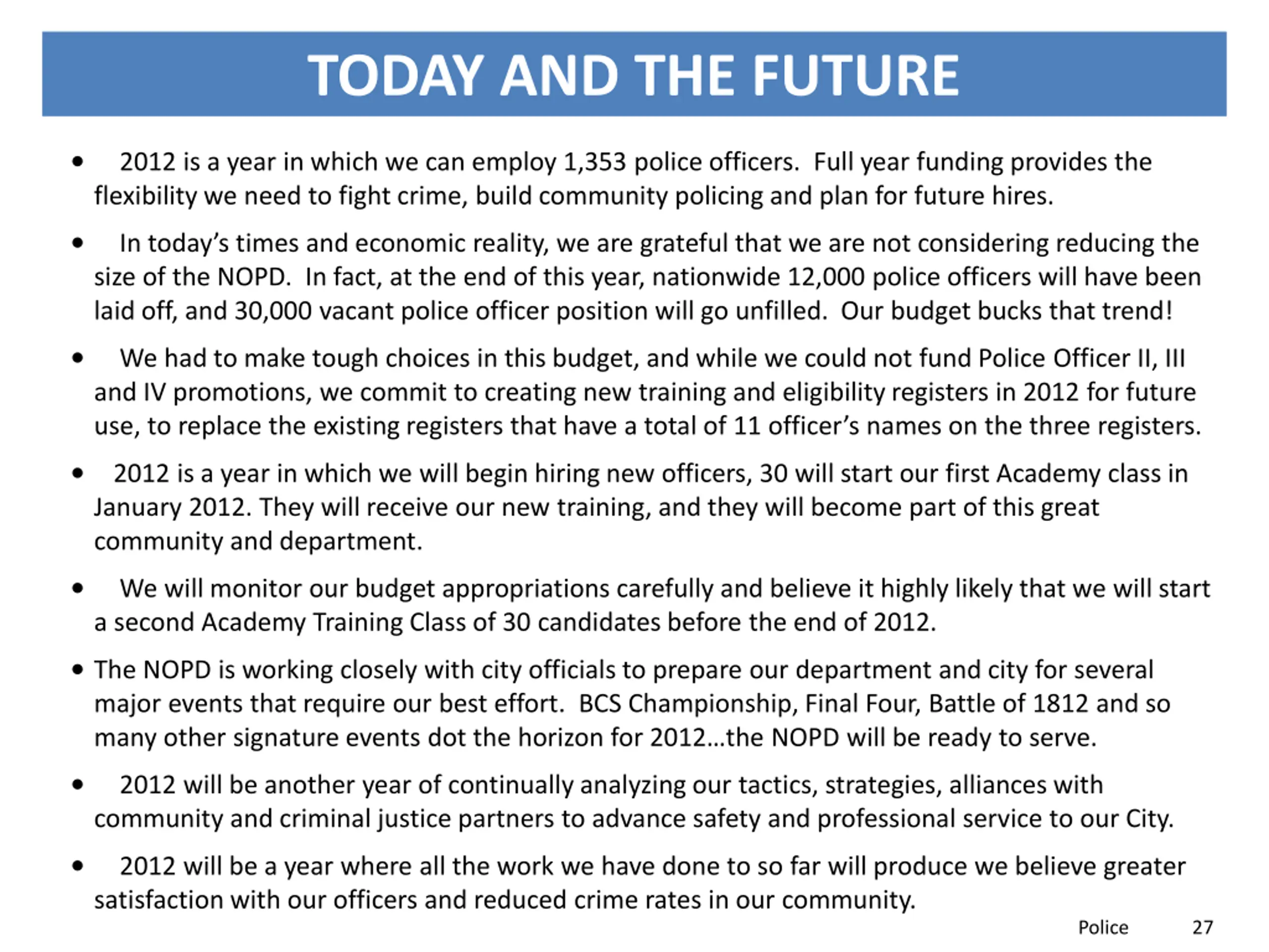 TODAY AND THE FUTURE 2012 is a year in which we can employ 1,353 police officers. Full year funding provides the flexibility we need to fight crime, build community policing and plan for future hires. In today s times and economic reality, we are grateful that we are not considering reducing the size of the NOPD. In fact, at the end of this year, nationwide 12,000 police officers will have been laid off, and 30,000 vacant police officer position will go unfilled. Our budget bucks that trend! We had to make tough choices in this budget, and while we could not fund Police Officer II, III and IV promotions, we commit to creating new training and eligibility registers in 2012 for future use, to replace the existing registers that have a total of 11 officer s names on the three registers. 2012 is a year in which we will begin hiring new officers, 30 will start our first Academy class in January 2012. They will receive our new training, and they will become part of this great community and department. We will monitor our budget appropriations carefully and believe it highly likely that we will start a second Academy Training Class of 30 candidates before the end of 2012. The NOPD is working closely with city officials to prepare our department and city for several major events that require our best effort. BCS Championship, Final Four, Battle of 1812 and so many other signature events dot the horizon for 2012 the NOPD will be ready to serve. 2012 will be another year of continually analyzing our tactics, strategies, alliances with community and criminal justice partners to advance safety and professional service to our City. 2012 will be a year where all the work we have done to so far will produce we believe greater satisfaction with our officers and reduced crime rates in our community. Police 27