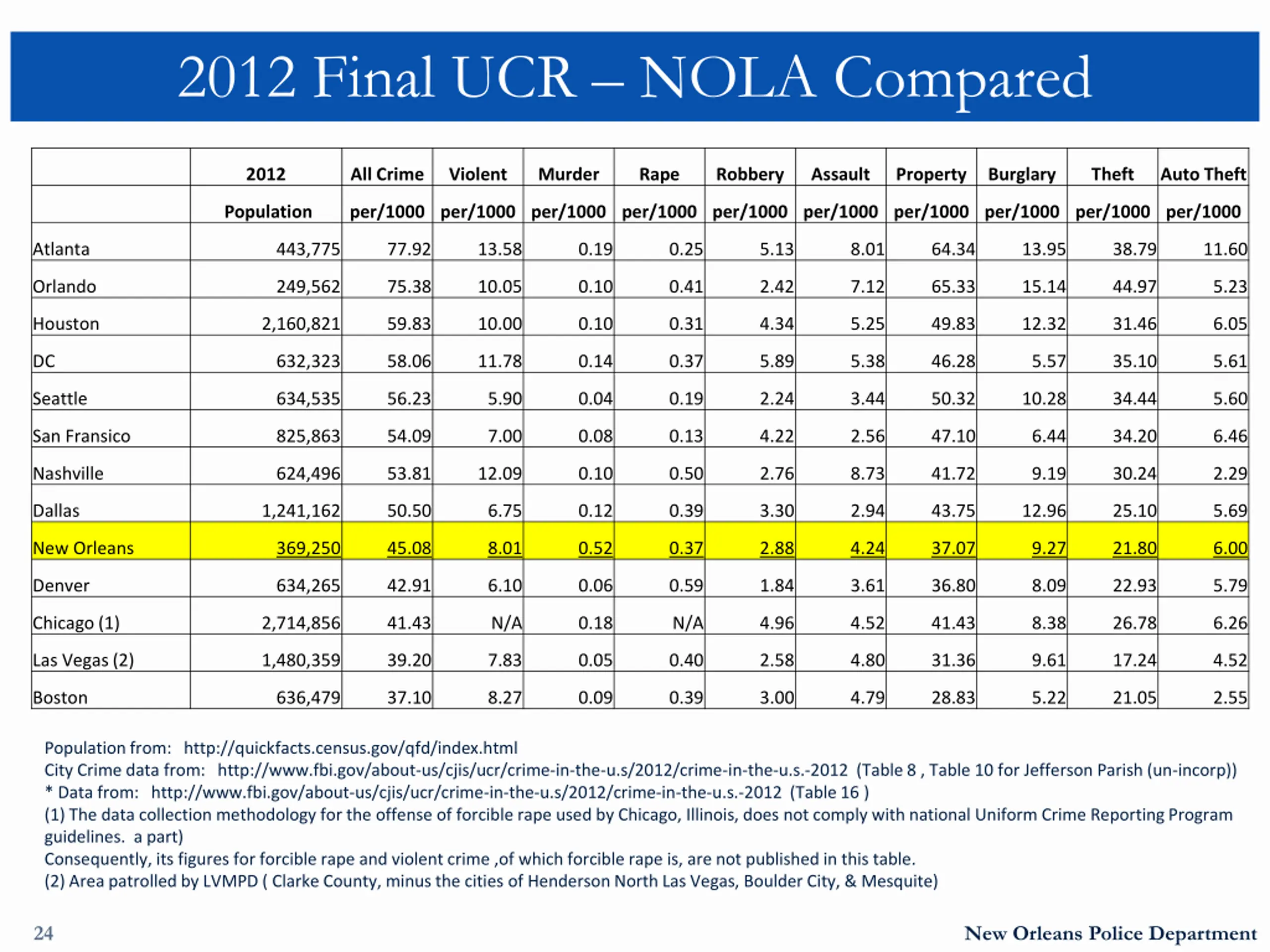 2012 Final UCR NOLA Compared 2012 All Crime Violent Murder Rape Robbery Assault Property Burglary Theft Auto Theft Population per/1000 per/1000 per/1000 per/1000 per/1000 per/1000 per/1000 per/1000 per/1000 per/1000 Atlanta 443,775 77.92 13.58 0.19 0.25 5.13 8.01 64.34 13.95 38.79 11.60 Orlando 249,562 75.38 10.05 0.10 0.41 2.42 7.12 65.33 15.14 44.97 5.23 Houston 2,160,821 59.83 10.00 0.10 0.31 4.34 5.25 49.83 12.32 31.46 6.05 DC 632,323 58.06 11.78 0.14 0.37 5.89 5.38 46.28 5.57 35.10 5.61 Seattle 634,535 56.23 5.90 0.04 0.19 2.24 3.44 50.32 10.28 34.44 5.60 San Fransico 825,863 54.09 7.00 0.08 0.13 4.22 2.56 47.10 6.44 34.20 6.46 Nashville 624,496 53.81 12.09 0.10 0.50 2.76 8.73 41.72 9.19 30.24 2.29 Dallas 1,241,162 50.50 6.75 0.12 0.39 3.30 2.94 43.75 12.96 25.10 5.69 New Orleans 369,250 45.08 8.01 0.52 0.37 2.88 4.24 37.07 9.27 21.80 6.00 Denver 634,265 42.91 6.10 0.06 0.59 1.84 3.61 36.80 8.09 22.93 5.79 Chicago (1) 2,714,856 41.43 N/A 0.18 N/A 4.96 4.52 41.43 8.38 26.78 6.26 Las Vegas (2) 1,480,359 39.20 7.83 0.05 0.40 2.58 4.80 31.36 9.61 17.24 4.52 Boston 636,479 37.10 8.27 0.09 0.39 3.00 4.79 28.83 5.22 21.05 2.55 Population from: http://quickfacts.census.gov/qfd/index.html City Crime data from: http://www.fbi.gov/about-us/cjis/ucr/crime-in-the-u.s/2012/crime-in-the-u.s.-2012 (Table 8 , Table 10 for Jefferson Parish (un-incorp)) * Data from: http://www.fbi.gov/about-us/cjis/ucr/crime-in-the-u.s/2012/crime-in-the-u.s.-2012 (Table 16 ) (1) The data collection methodology for the offense of forcible rape used by Chicago, Illinois, does not comply with national Uniform Crime Reporting Program guidelines. a part) Consequently, its figures for forcible rape and violent crime ,of which forcible rape is, are not published in this table. (2) Area patrolled by LVMPD ( Clarke County, minus the cities of Henderson North Las Vegas, Boulder City, & Mesquite) 24 New Orleans Police Department